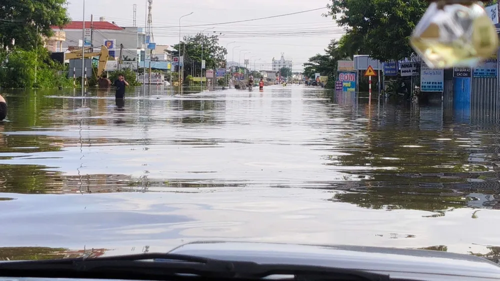 Quốc lộ 1A đoạn từ cầu Bến Lội về hướng Phú Long ngập nặng vào sáng sớm 31-10.