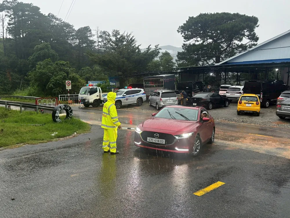 Phòng CSGT Lâm Đồng đã lập chốt chặn, tạm thời không cho phương tiện lưu thông qua đèo để phục vụ công tác khắc phục.