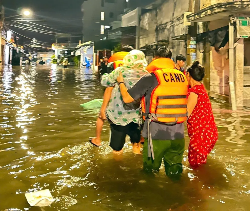 Lực lượng công an hỗ trợ người dân Phan Thiết đến nơi an toàn.