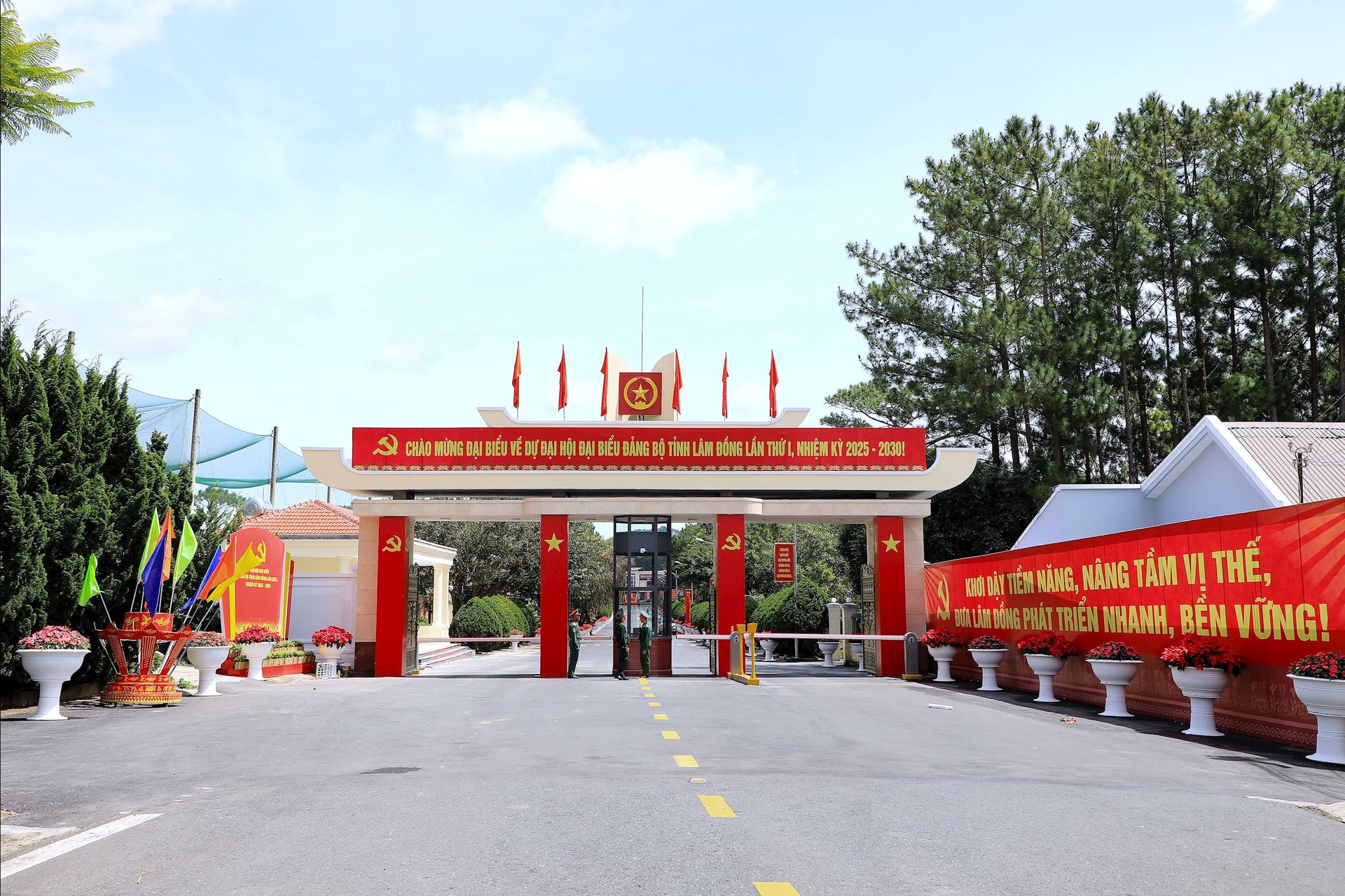 Cổng Học viện Lục quân Đà Lạt rợp cờ hoa, khẩu hiệu chào mừng Đại hội đại biểu Đảng bộ tỉnh Lâm Đồng lần thứ I