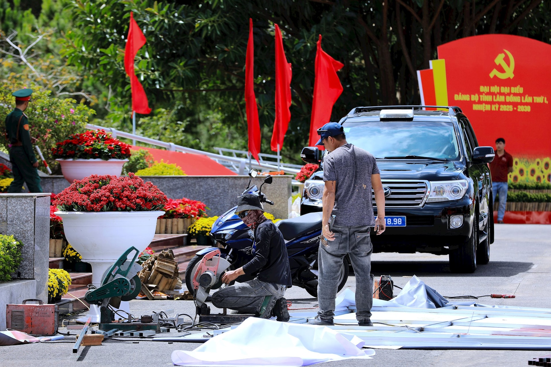 Công nhân thi công các phần viện bên ngoài khu vực hội trường diễn ra Đại hội