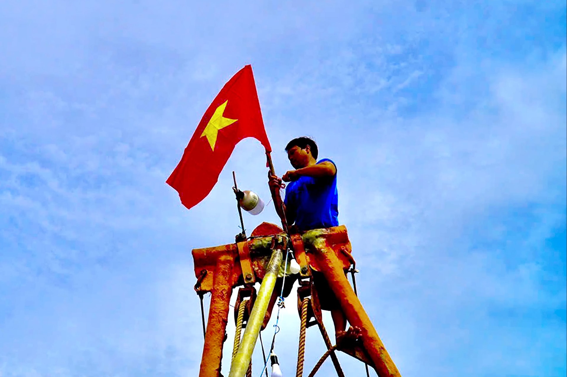 Ngư dân Lâm Đồng lắp đặt cờ Tổ quốc lên cột thuyền của mình
