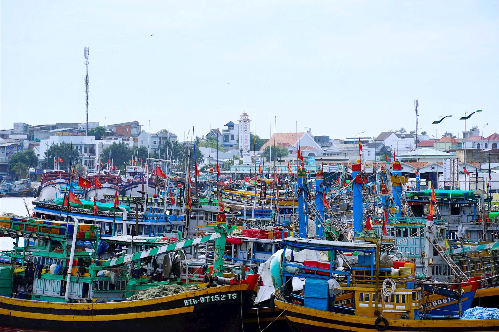 Cờ đỏ rực rỡ trên nóc một nhóm thuyền của ngư dân Lâm Đồng