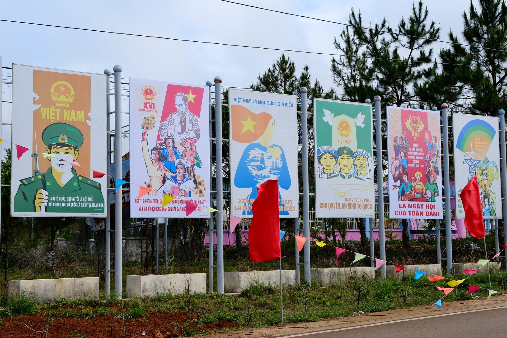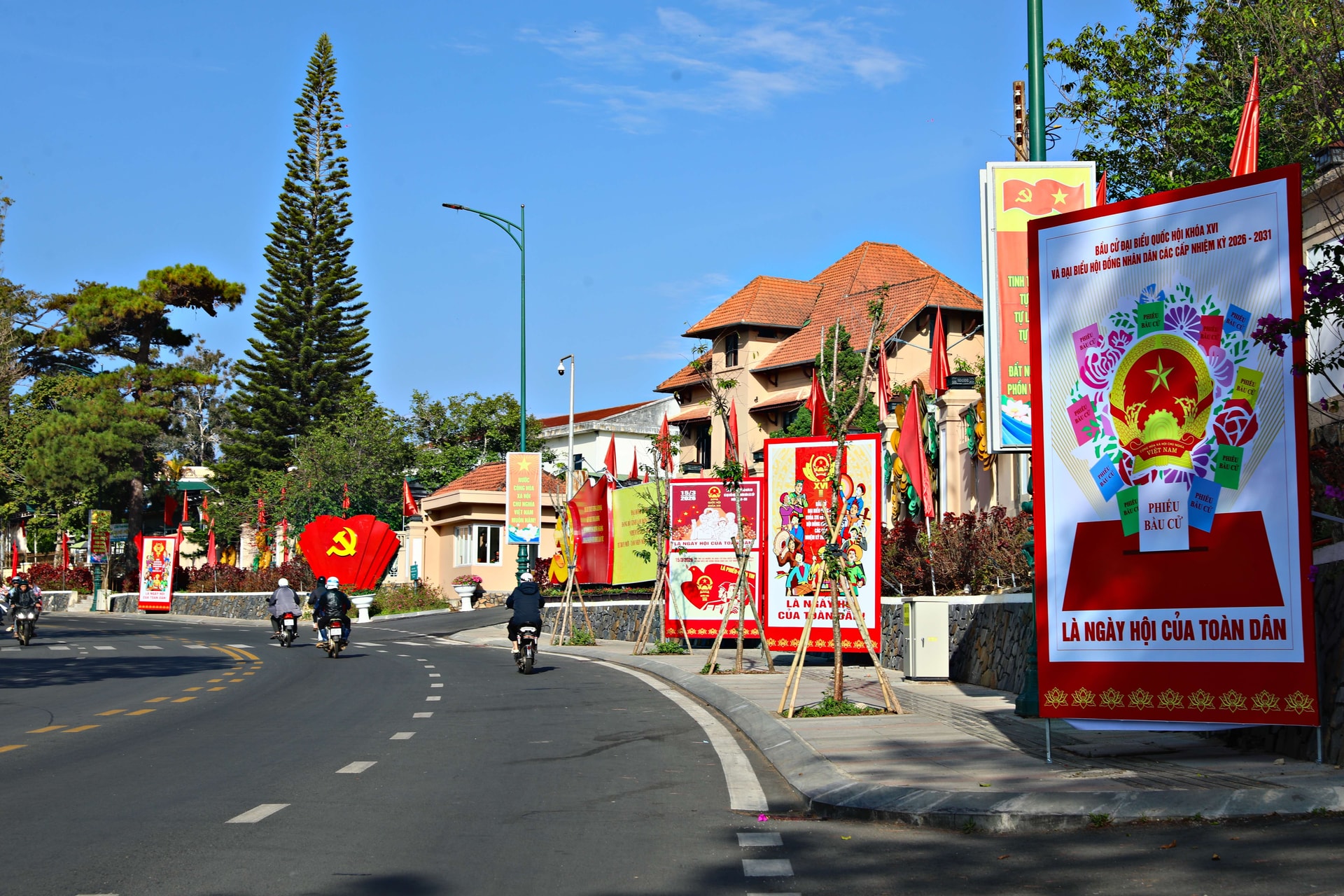 Những pano lớn với nội dung tuyên truyền về quyền và nghĩa vụ của cử tri được bố trí ở những vị trí dễ quan sát, tạo nên điểm nhấn nổi bật giữa không gian đô thị cao nguyên. Dưới những tán thông xanh đặc trưng của Đà Lạt, sắc đỏ của cờ hoa càng trở nên nổi bật, mang đến cảm giác vừa trang nghiêm vừa ấm áp.