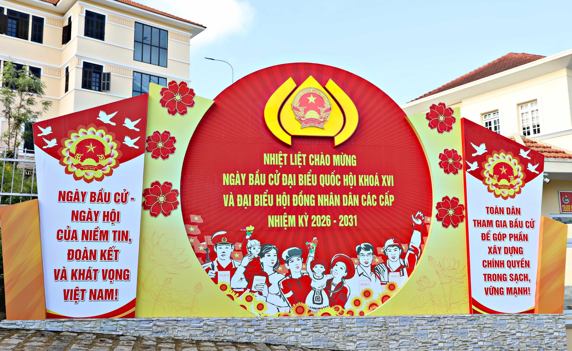 Pano tuyên truyền ngày bầu cử ĐBQH và HĐND các cấp nhiệm kỳ 2026-2031 được trang trí trang trọng tại các khu vực bỏ phiếu