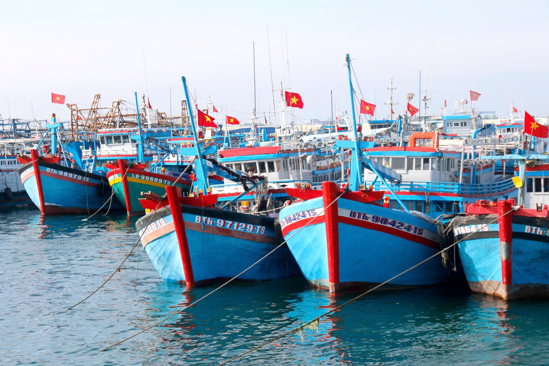Các tàu, thuyền ở đặc khu Phú Quý đồng loạt thay cờ mới đề chào mừng ngày bầu cử