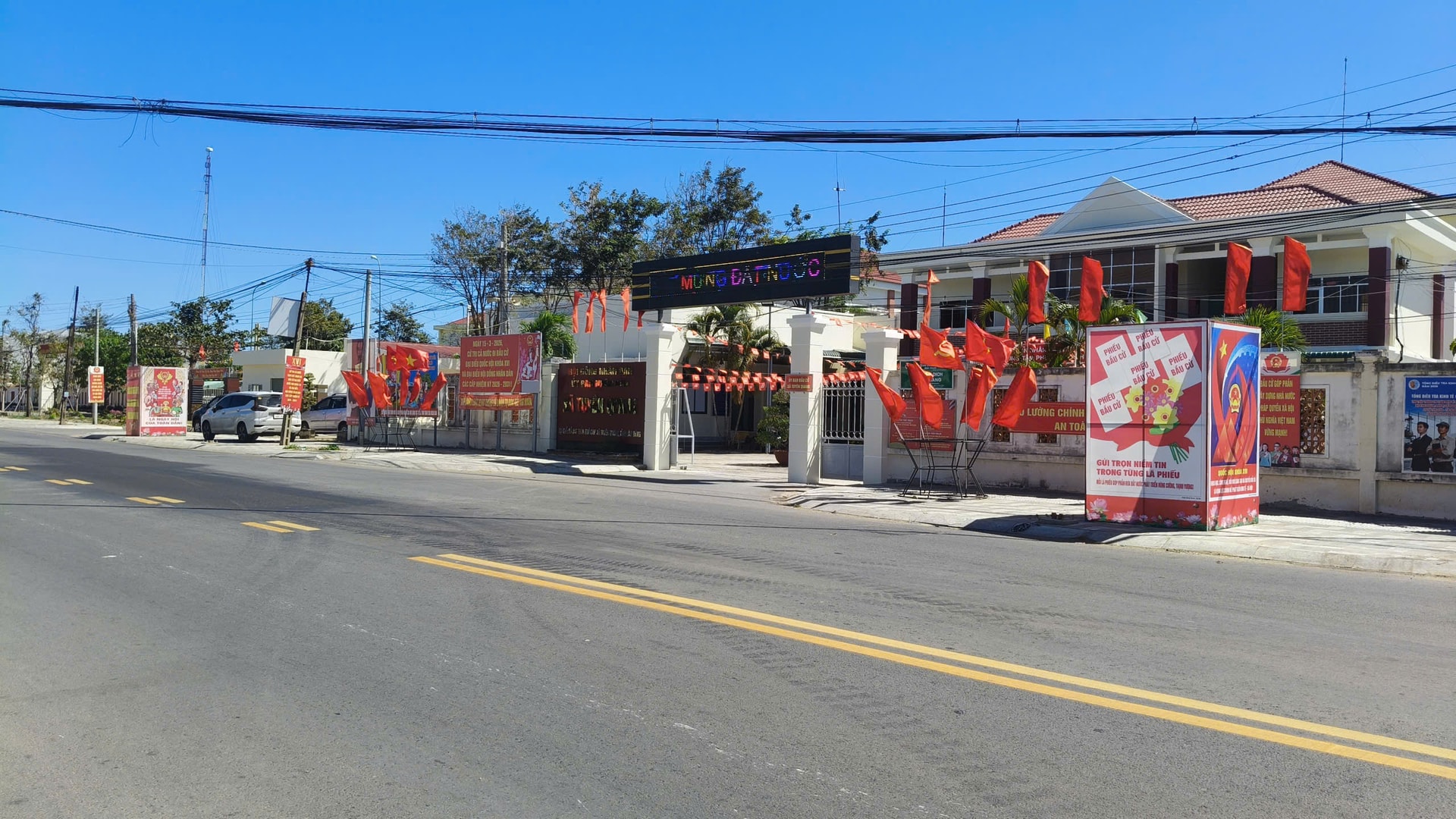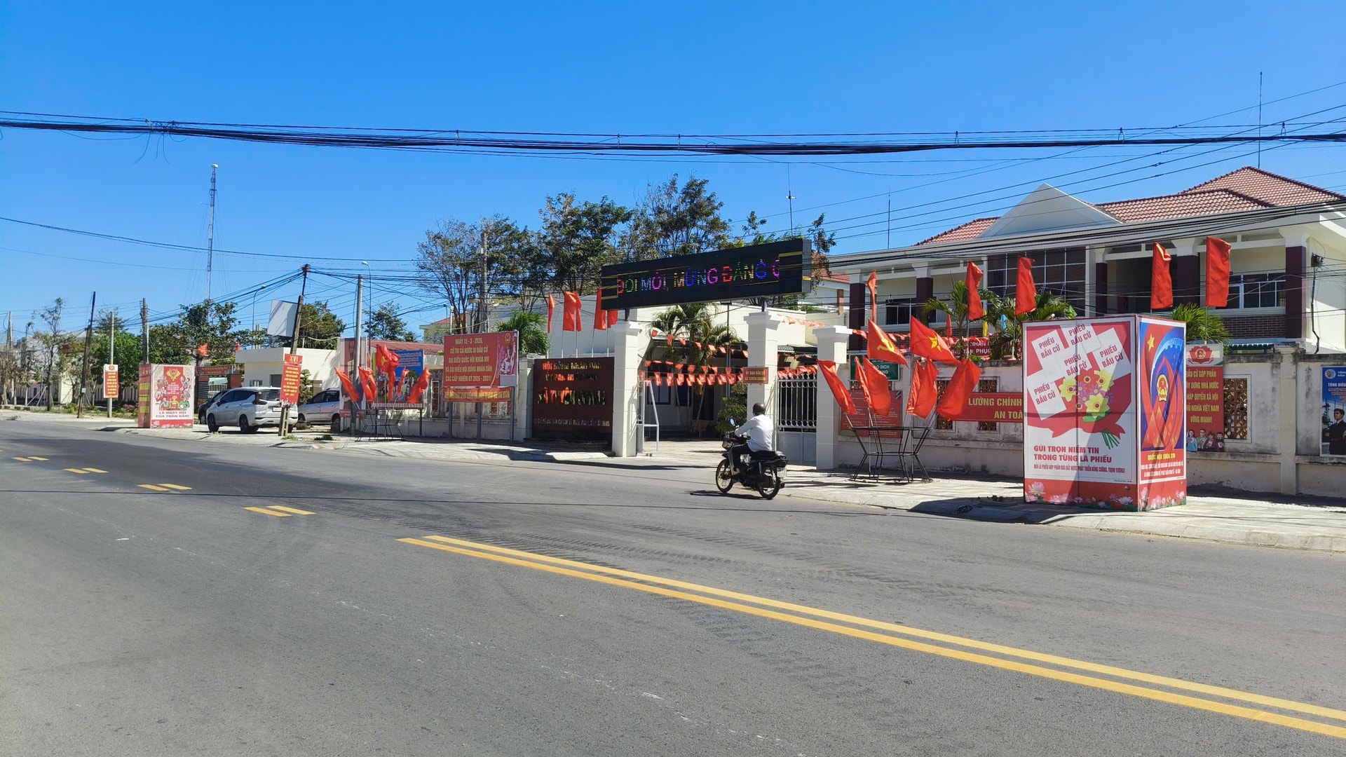 Ở khu vực Phan Thiết không khí chuẩn bị cho ngày bầu cử cũng diễn ra sôi nổi không kém. Dọc theo các tuyến đường ven biển, trên các khu phố du lịch và khu dân cư, cờ Tổ quốc được treo trang trọng trước mỗi ngôi nhà. Những cụm pano, áp phích tuyên truyền được lắp đặt tại các quảng trường, vòng xoay và khu vực đông người qua lại, góp phần tạo nên bầu không khí rộn ràng của ngày hội non sông.