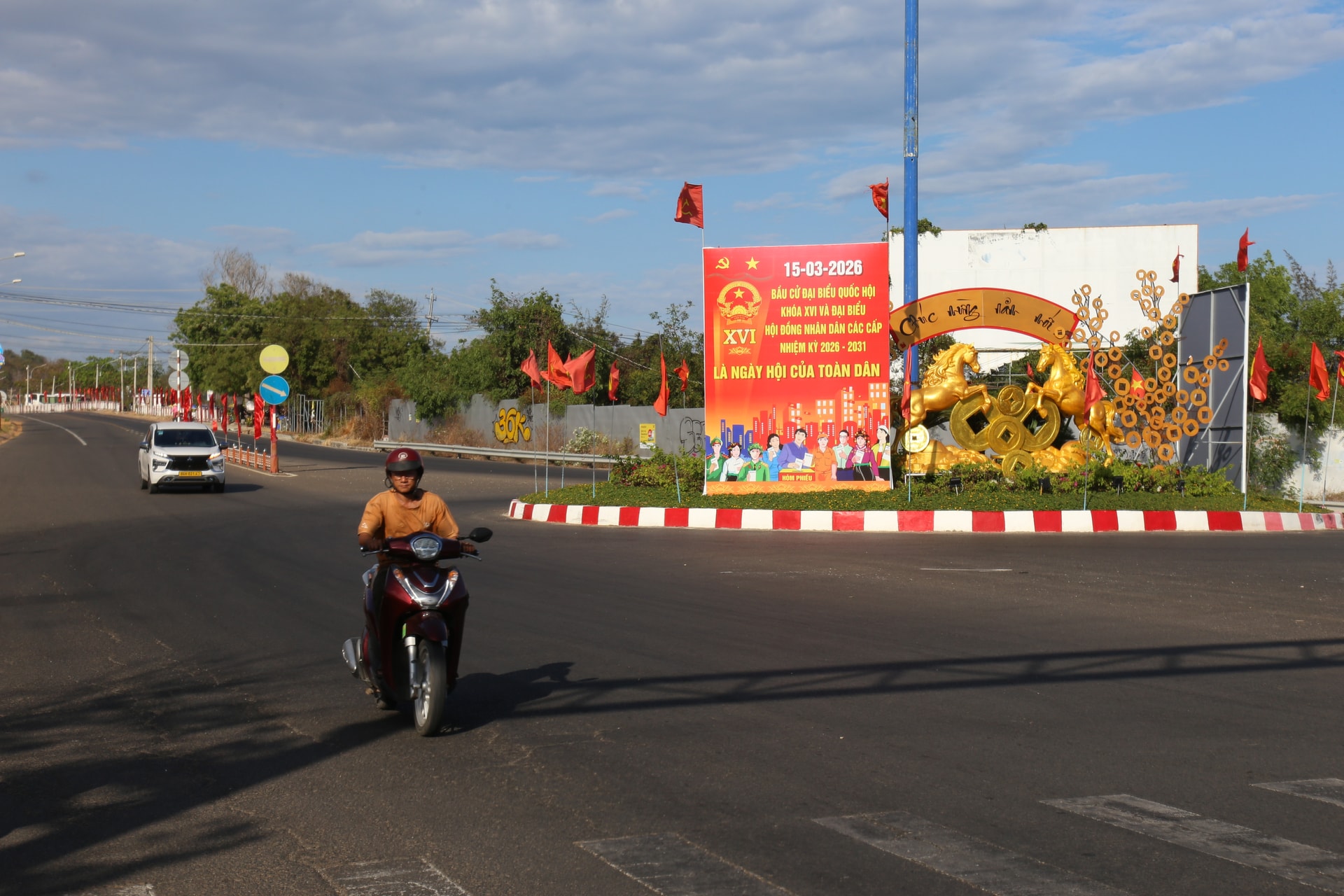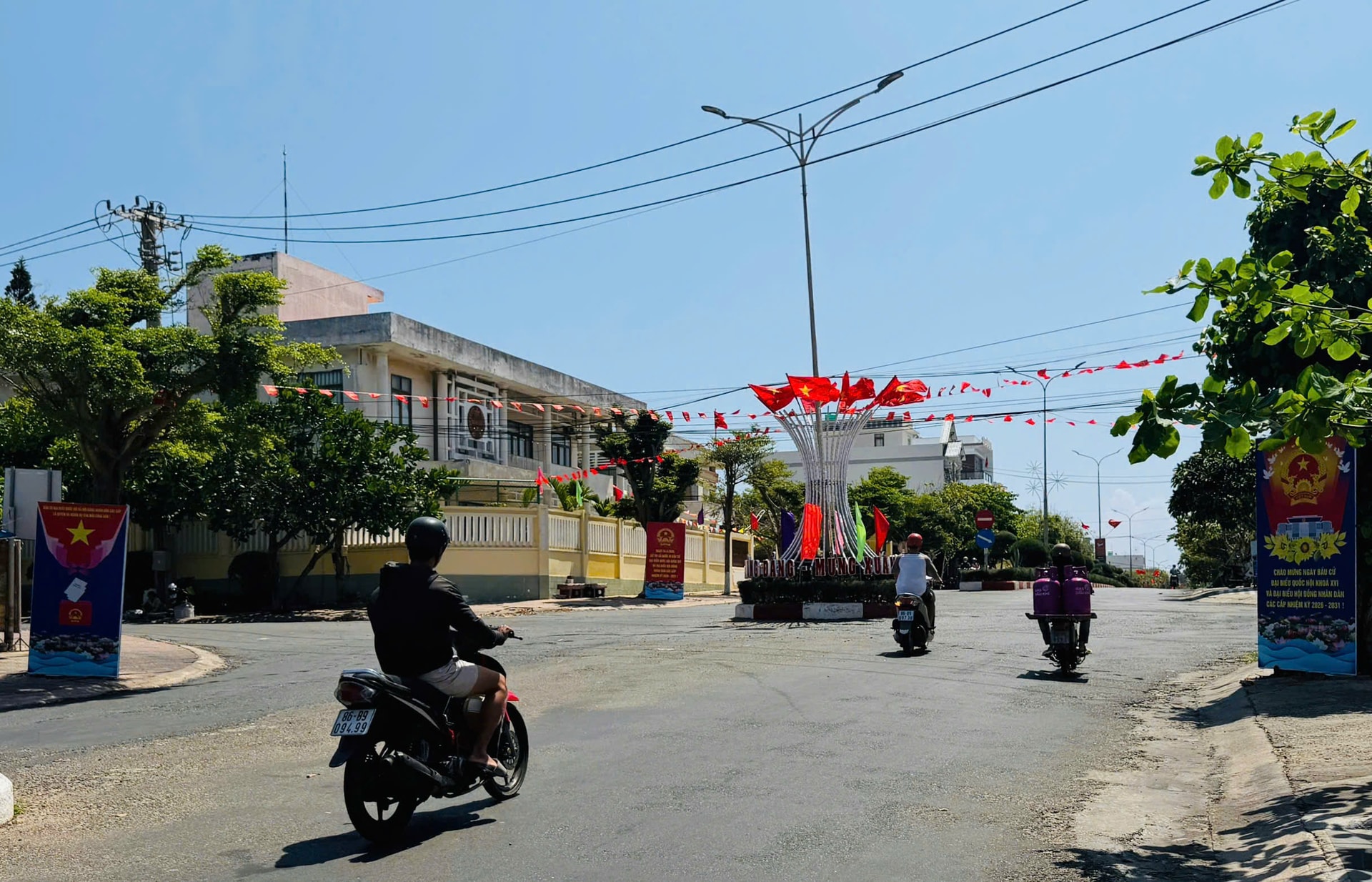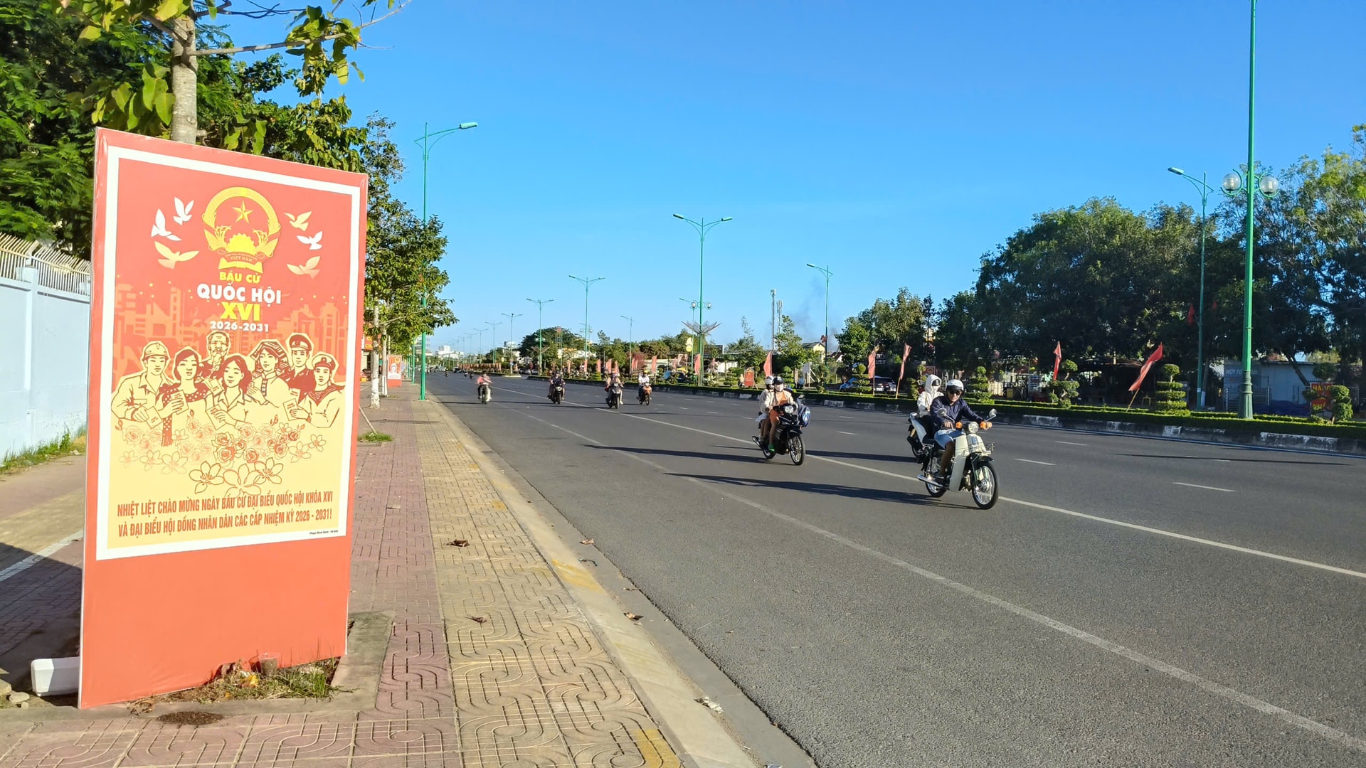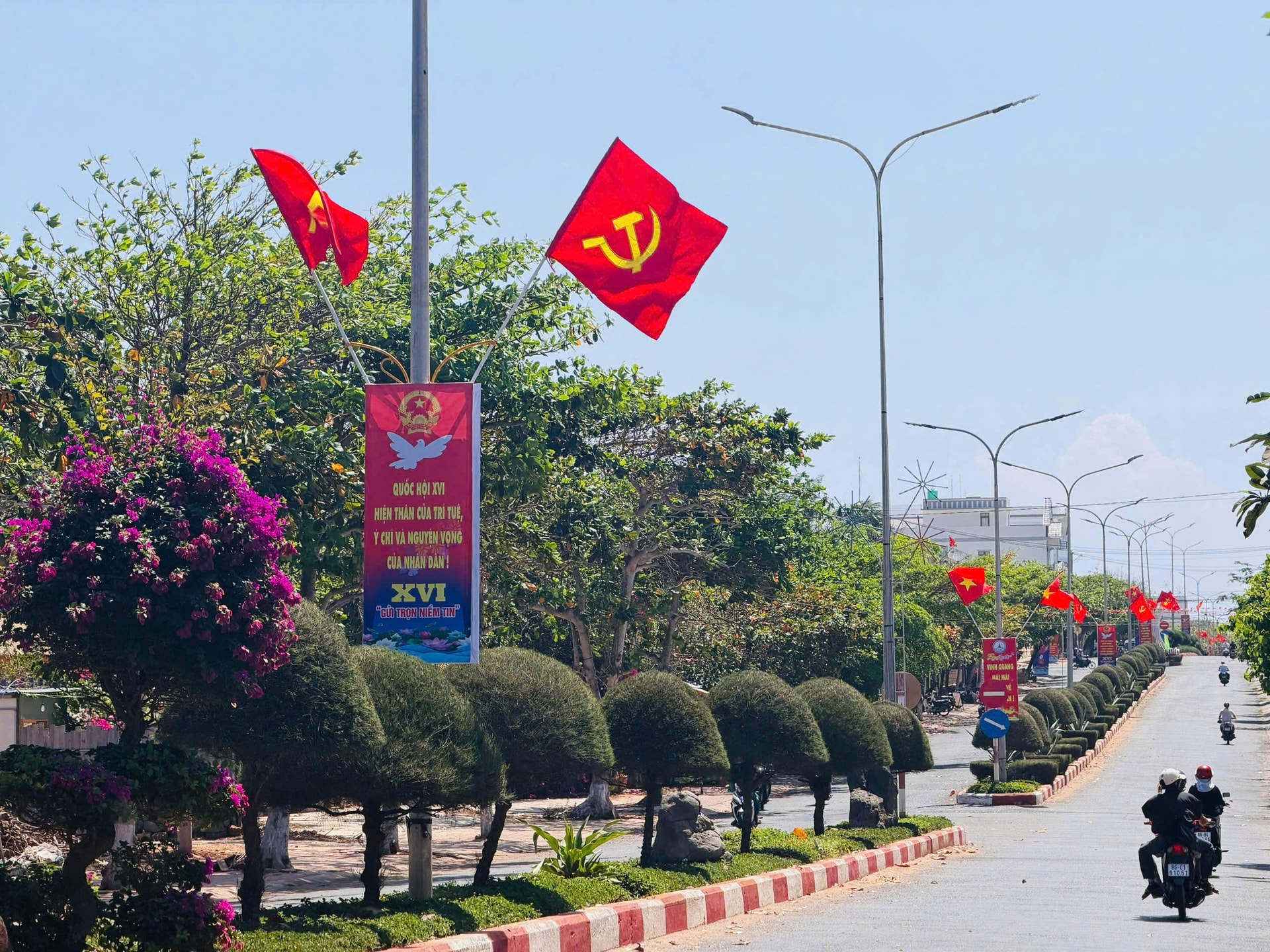 Các tuyến đường ở khu vực Phan Thiết được trang trí với nhiều cờ, pano tuyên truyền bầu cử