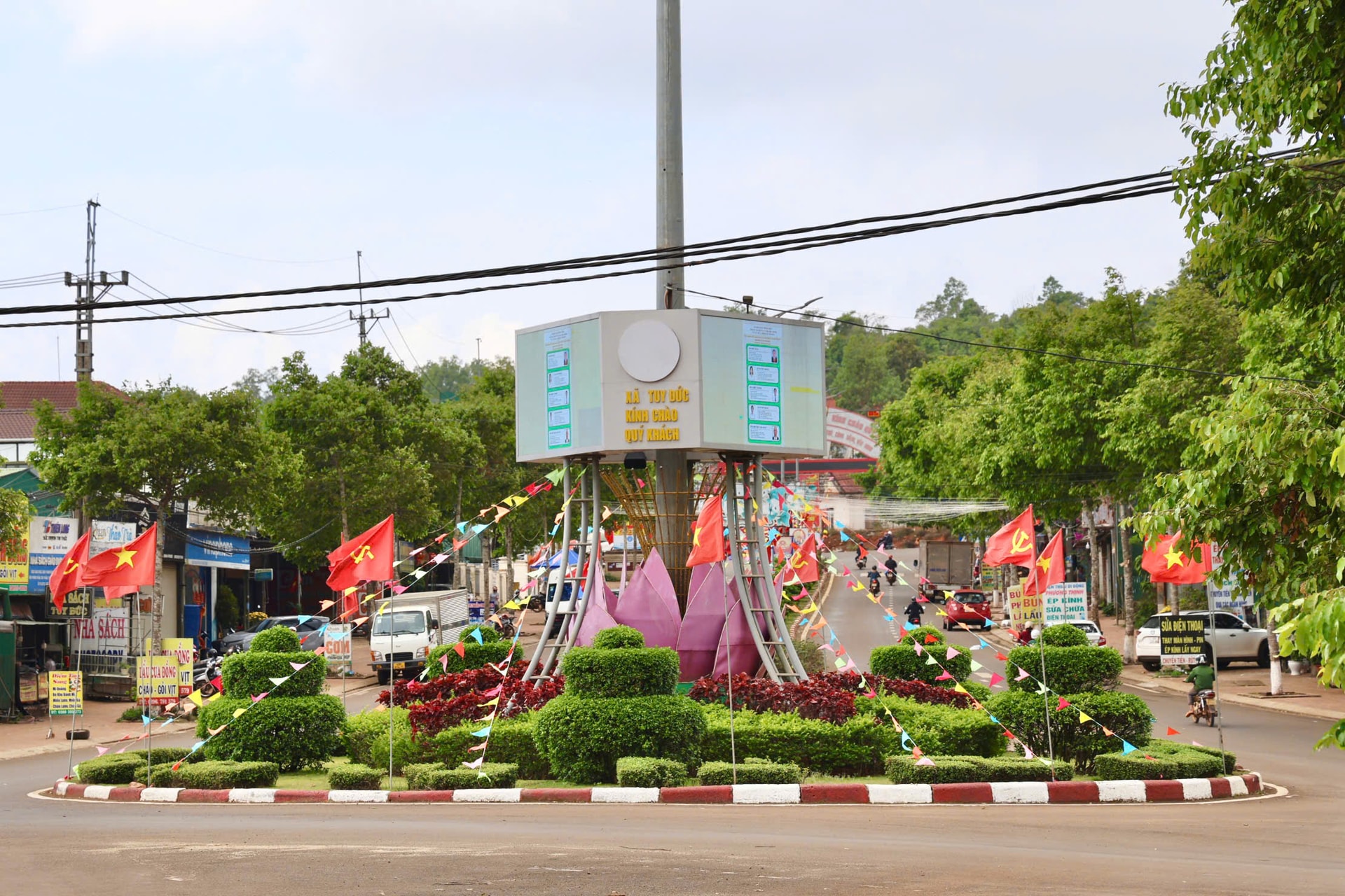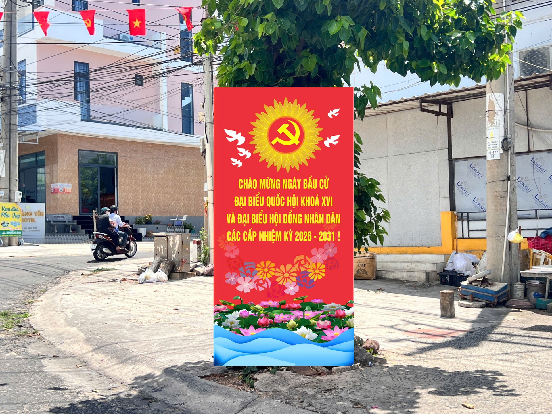 Không chỉ ở trung tâm hành chính, nhiều tuyến phố thương mại, khu dân cư và khu du lịch cũng đồng loạt treo cờ, treo băng rôn chào mừng ngày bầu cử.