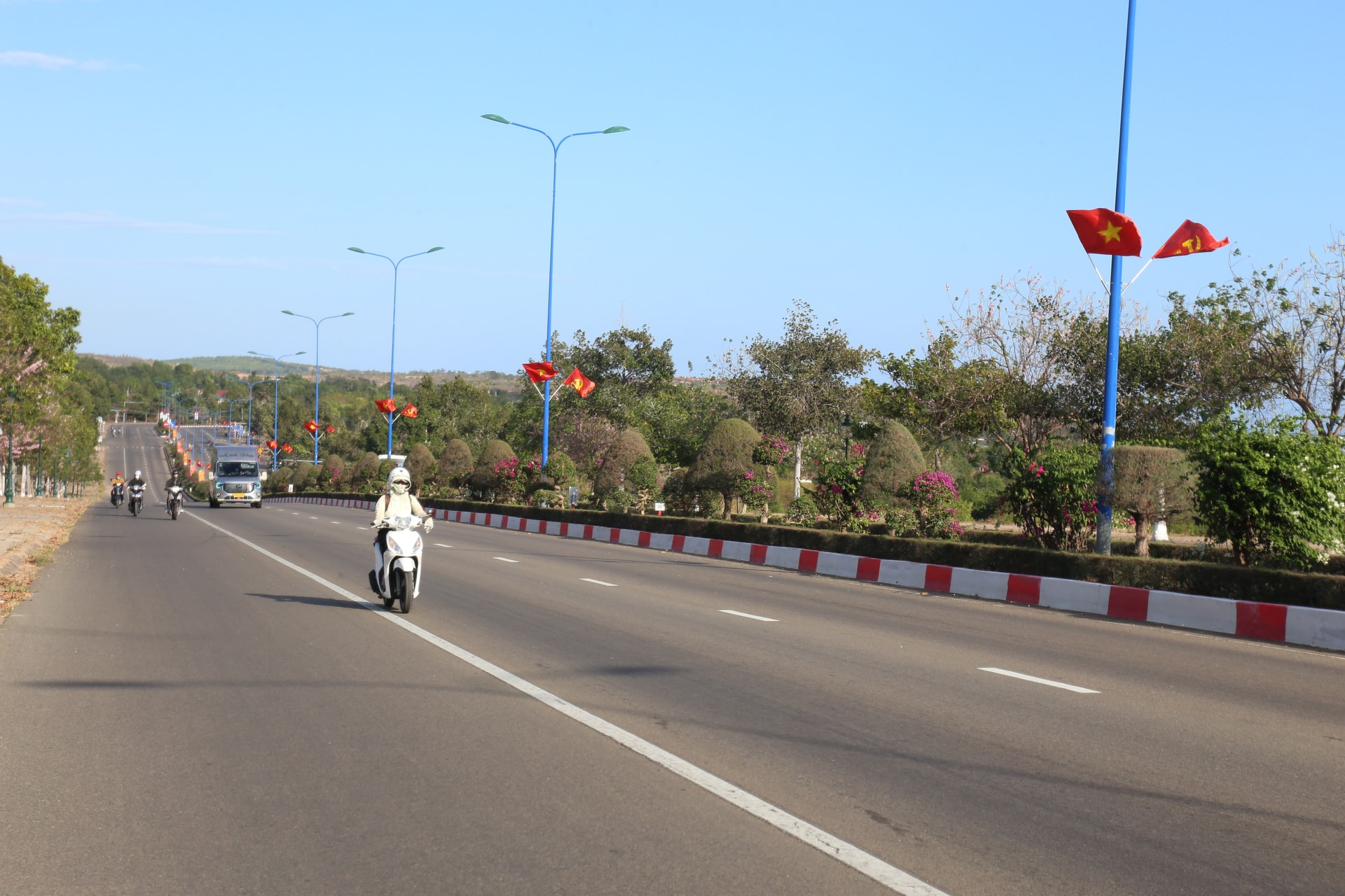 Tuyến đường Võ Nguyên Giáp ở trung tâm du lịch Mũi Né dợp bóng cờ hoa, biểu ngữ