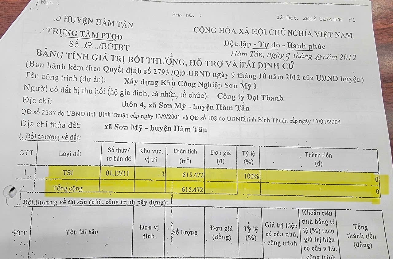 Tài liệu (kèm theo Quyết định số 2793/QĐ-UBND ngày 9/10/2012 của UBND huyện Hàm Tân), thể hiện số tiền bồi thường 615.472m2 đất bị thu hồi là 0 đồng. Ảnh: Quang Phương