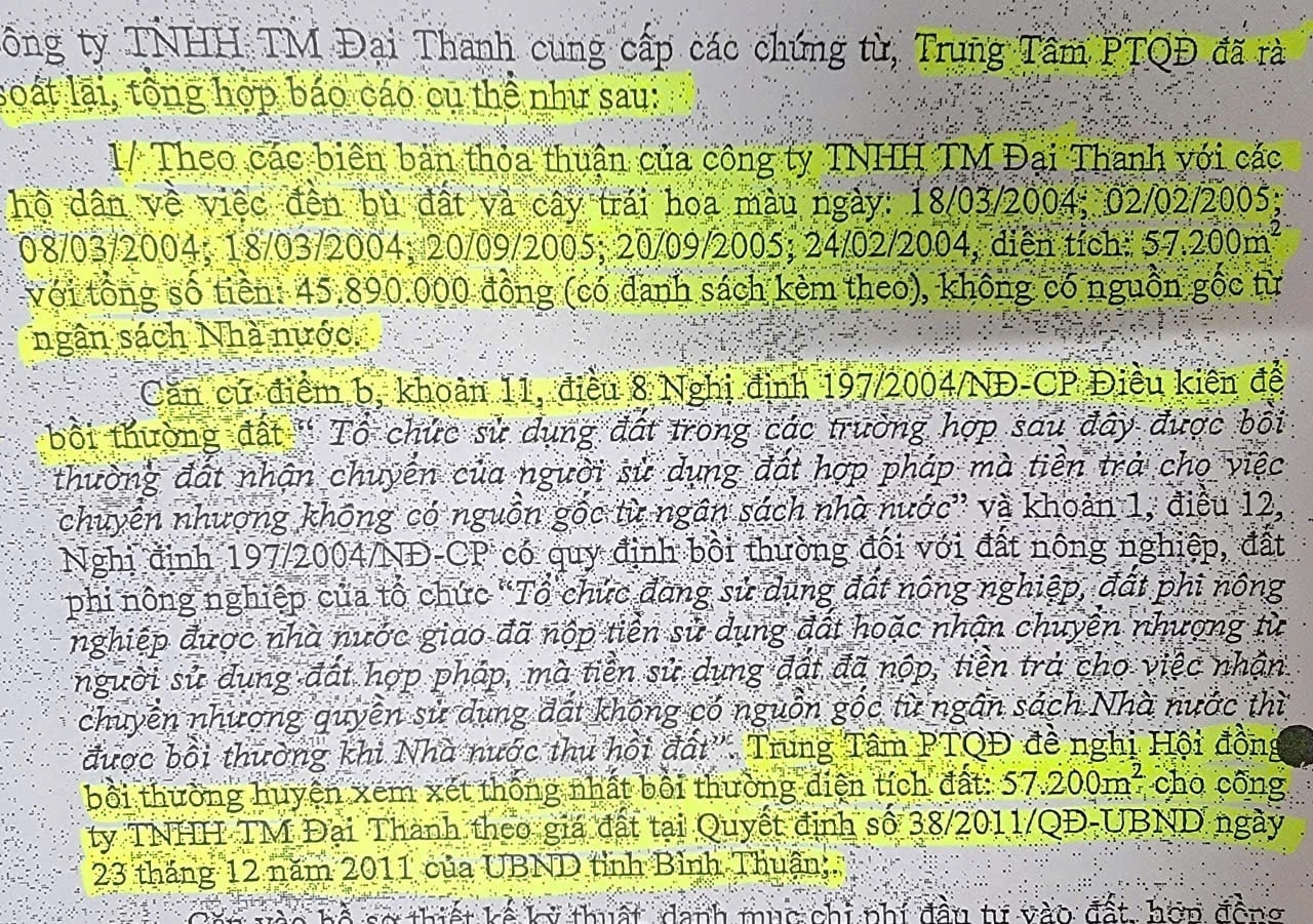 Theo Công ty Đại Thanh, các quyết định chi trả tiền bồi thường, hỗ trợ (nêu trên) không dẫn chiếu quyết định thu hồi đất của UBND tỉnh nên huyện Hàm Tân đã "quên" luôn việc bồi thường về đất, do không thống nhất diện tích đất thu hồi. Từ đó, việc phê duyệt các phương án bồi thường tài sản trên đất cũng liên tục bị "xáo trộn", thay đổi suốt hơn 10 năm qua.