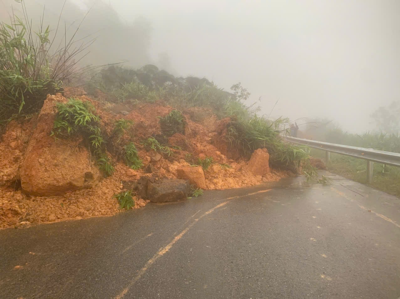 Quốc lộ 28B, khu vực đèo Đại Ninh xảy ra vụ sạt lở ta luy, khiến lượng lớn đất đá tràn xuống mặt đường, gây ách tắc giao thông (ảnh: N. Luân)