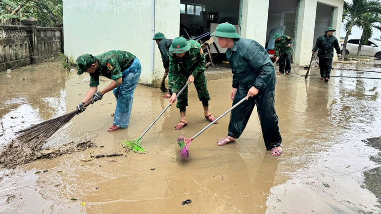 Bộ đội Biên phòng dọn dẹp vệ sinh ở xã Hòa Xuân, tỉnh Đắk Lắk sau mưa lũ. Ảnh: nhandan.vn