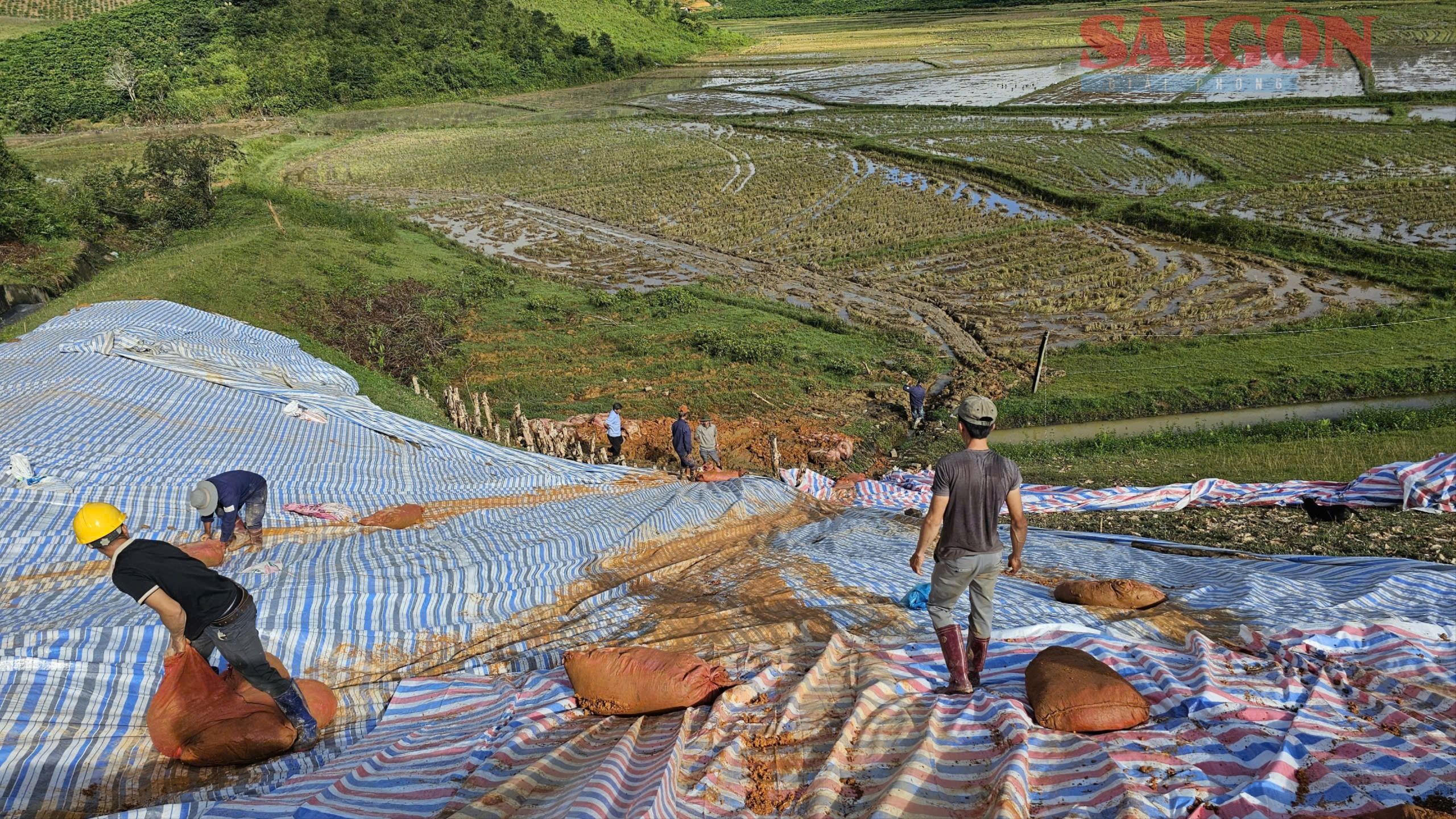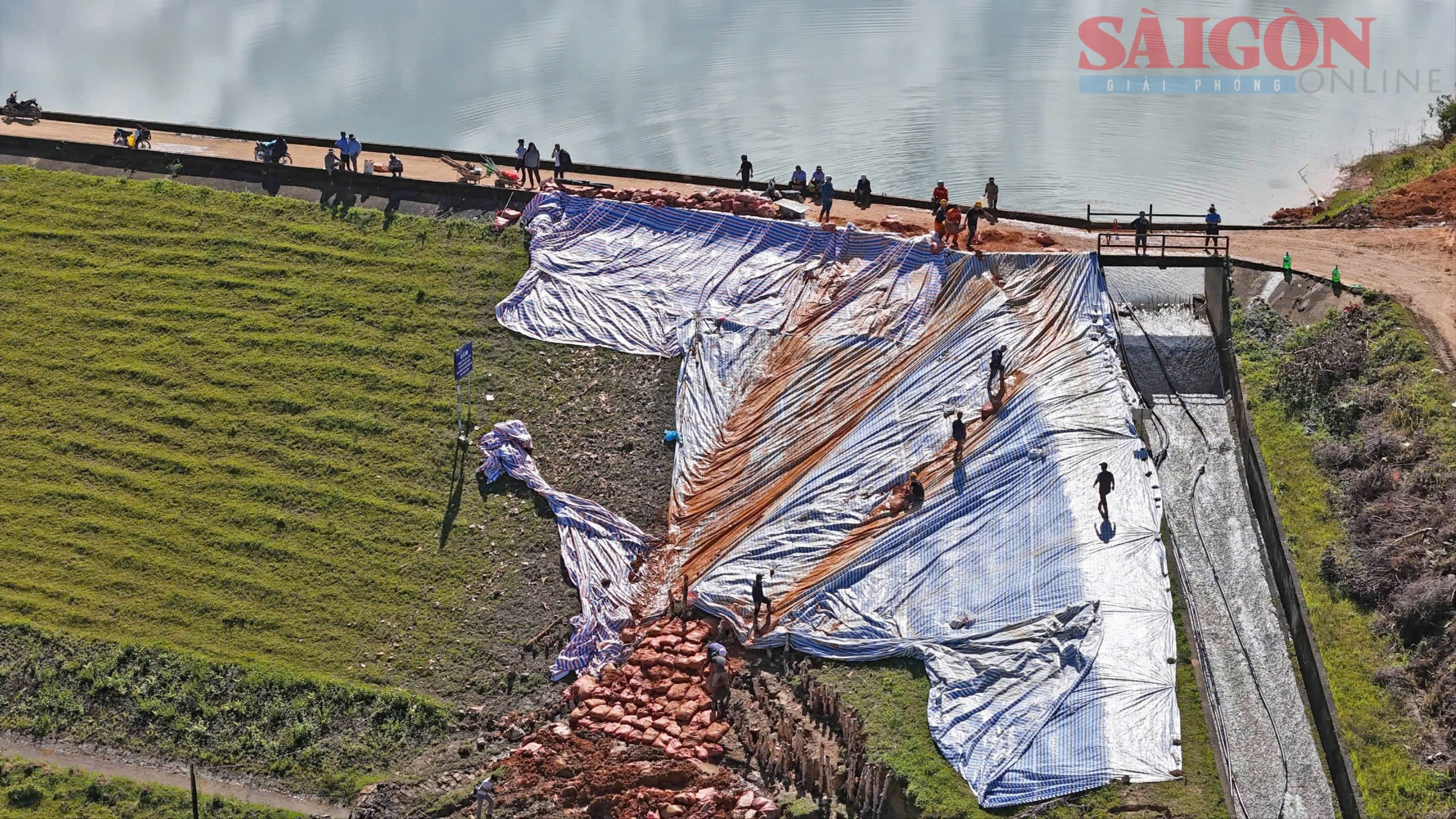 Vị trí sụt lún đập hồ Cay An đến chiều 8-11 đã cơ bản được gia cố
