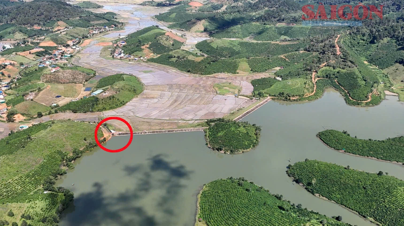 Vị trí sụt lún (khoanh tròn) của đập hồ chứa Cay An, xã Tà Năng nhìn từ trên cao