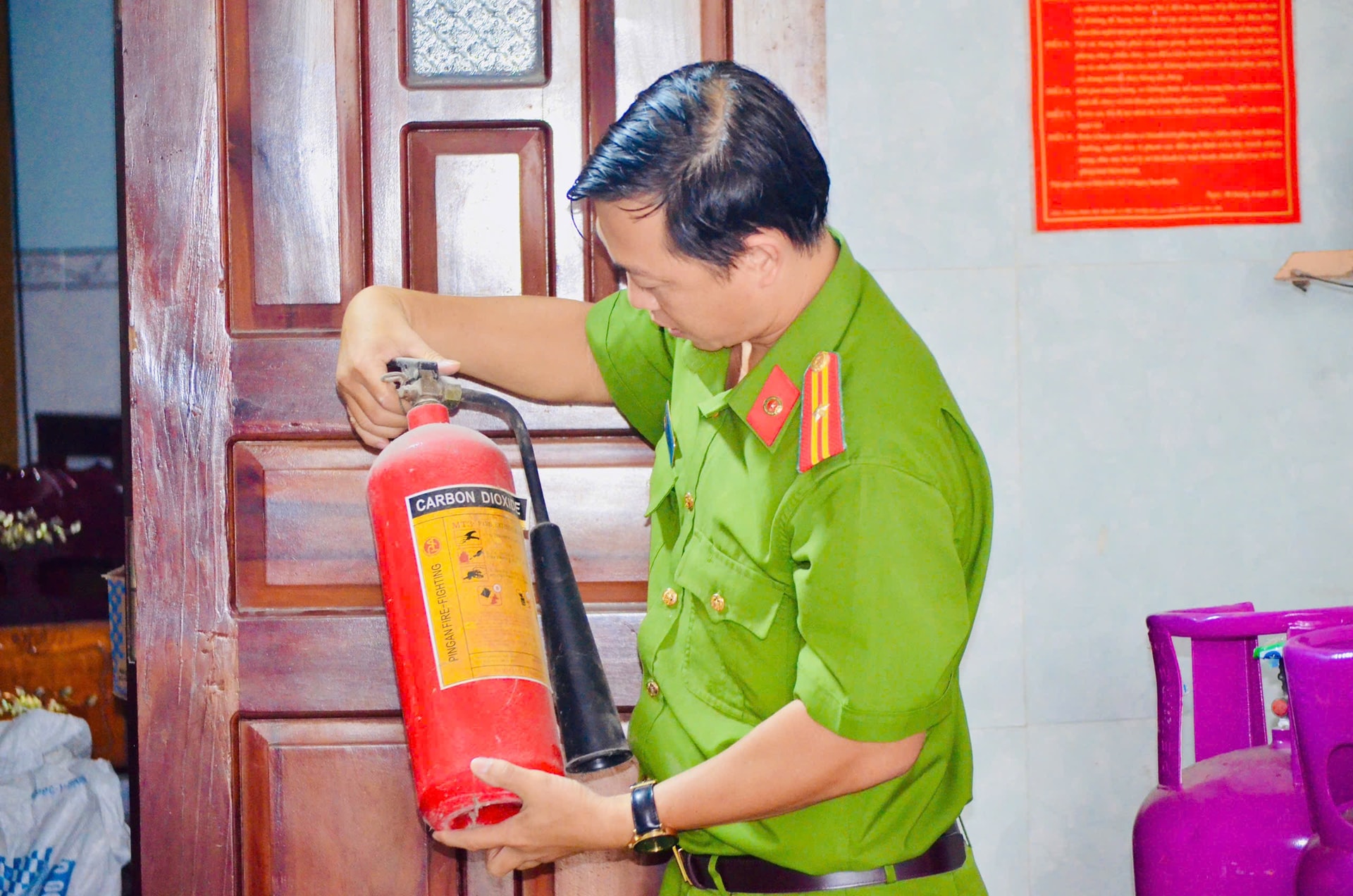 Thiếu tá Nguyễn Thái Minh, Tổ phó Tổ Cảnh sát khu vực, Công an phường La Gi kiểm tra bình chữa cháy