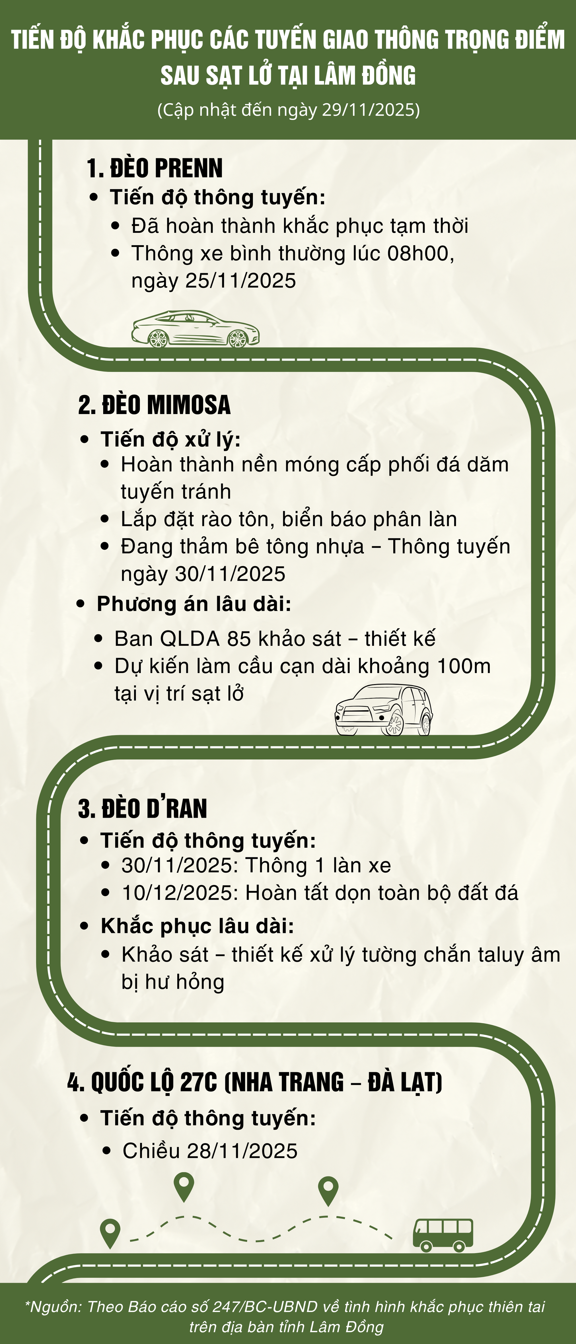Tuyến đèo Prenn, cửa ngõ dẫn vào trung tâm Đà Lạt, đã được xử lý sạt lở tạm thời và chính thức thông xe lúc 8 giờ ngày 25/11. Tại đèo Mimosa, tuyến tránh tạm thời đã hoàn thành cùng hệ thống biển báo và rào chắn, đang được thảm nhựa và dự kiến thông tuyến vào 30/11.