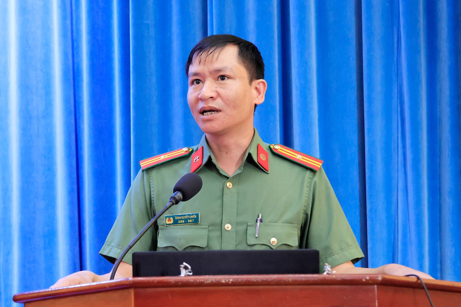 Báo cáo viên Thiếu tá Đinh Quyết Chiến, Phòng An ninh chính trị nội bộ Công an tỉnh Lâm Đồng truyền đạt các nội dung tập huấn