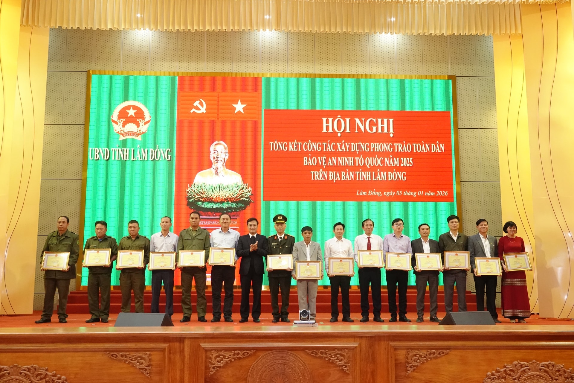 Phó Chủ tịch UBND tỉnh Lâm Đồng Đinh Văn Tuấn trao Bằng khen của Chủ tịch UBND tỉnh cho các cá nhân có thành tích xuất sắc trong phong trào thi đua Toàn dân bảo vệ an ninh Tổ quốc trên địa bàn tỉnh năm 2025 (ảnh: Nguyễn Luân)