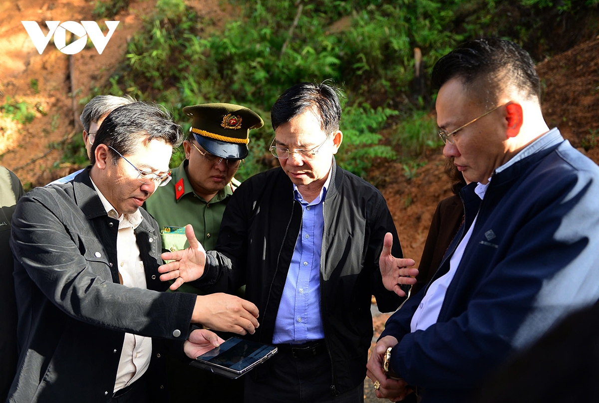 Ông Hồ Văn Mười, Phó Bí Tỉnh ủy, Chủ tịch UBND tỉnh Lâm Đồng (giữa ảnh) kiểm tra thực địa sạt lở trên đèo D’ran - Quốc lộ 20.