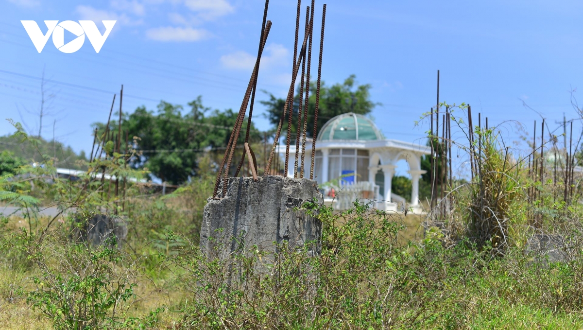Nhiều hạng mục dang dở, cột bê tông phơi sắt hoen gỉ trong khu vực Dự án Sài Gòn Đại Ninh, sau hơn một thập kỷ triển khai nhưng không đưa đất vào sử dụng theo cam kết.