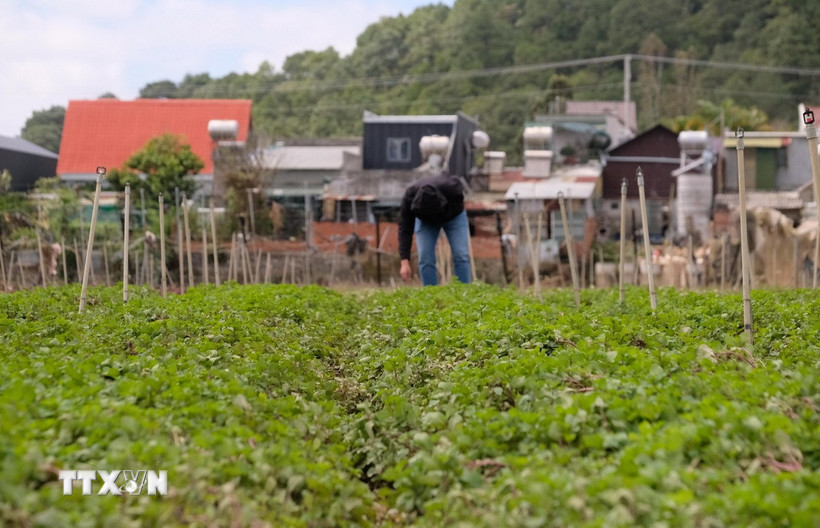Anh Nguyễn Văn Lượng (xã Ka Đô) tranh thủ thu hoạch vườn củ dền bị nước ngập kéo dài để xuống giống vụ rau mới. (Ảnh: Nguyễn Dũng/ TTXVN)