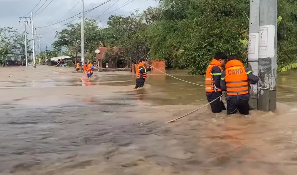Tại xã Hàm Thạnh, nước lũ dâng cao khiến nhiều hộ gia đình bị kẹt. Trong sáng 4-12, lực lượng Công an xã đã giăng dây qua sông giải cứu được 6 người.