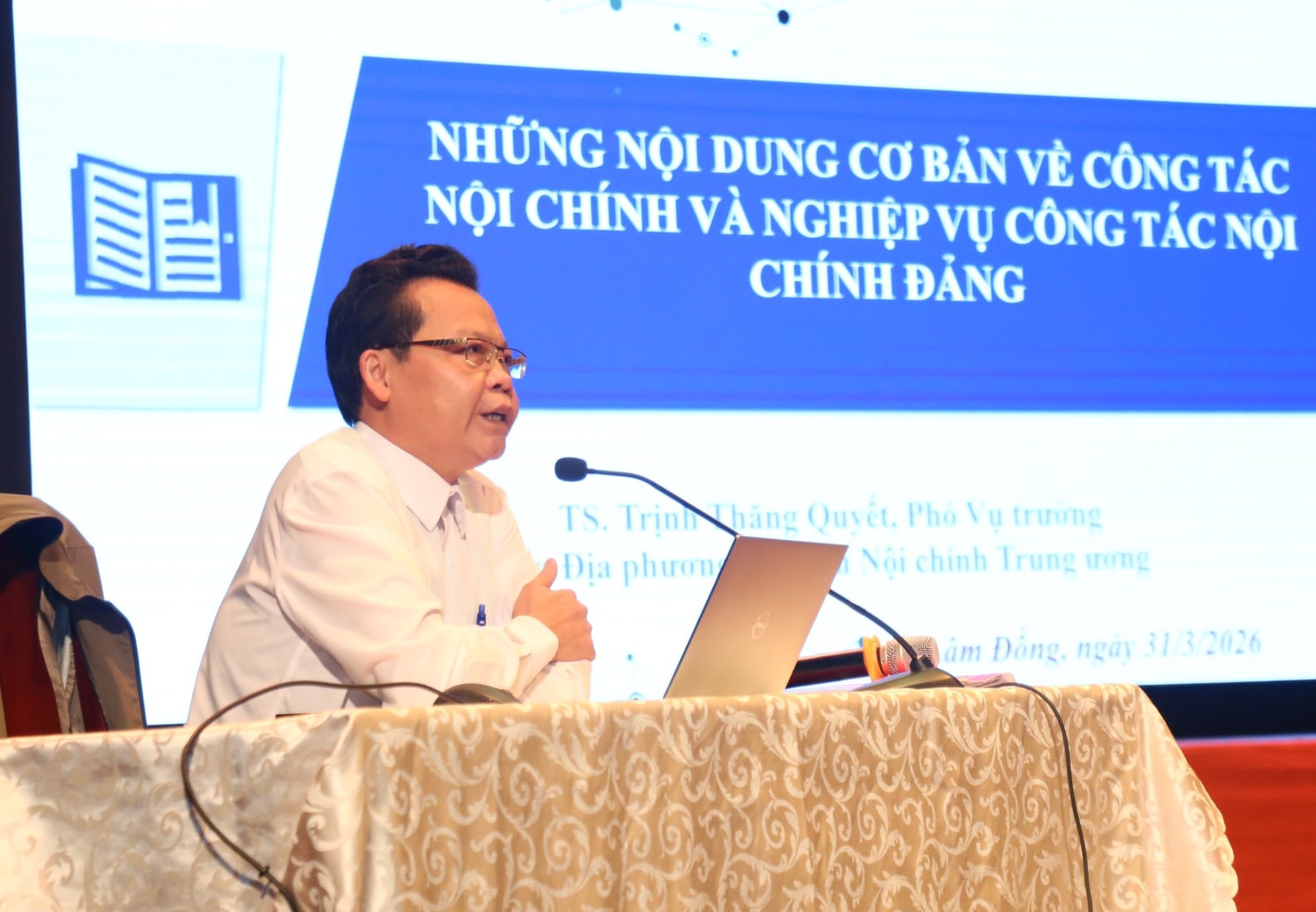 Tiến sĩ Trịnh Thăng Quyết, Phó Vụ trưởng Vụ Địa phương III, Ban Nội chính Trung ương trình bày các chuyên đề tại hội nghị tập huấn