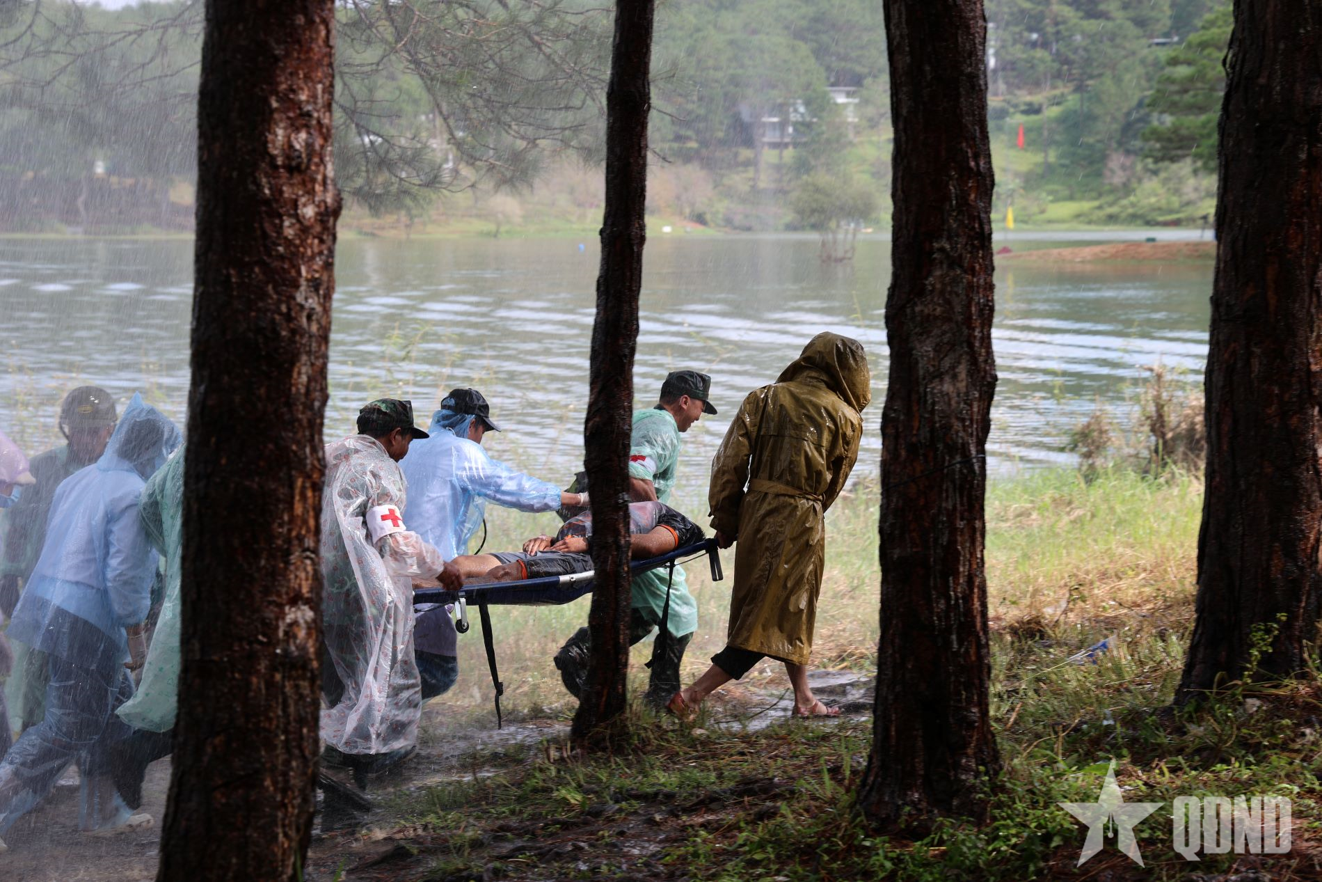 Thực hành vận chuyển, cấp cứu nạn nhân trong diễn tập phòng thủ dân sự cấp xã tỉnh Lâm Đồng năm 2025.