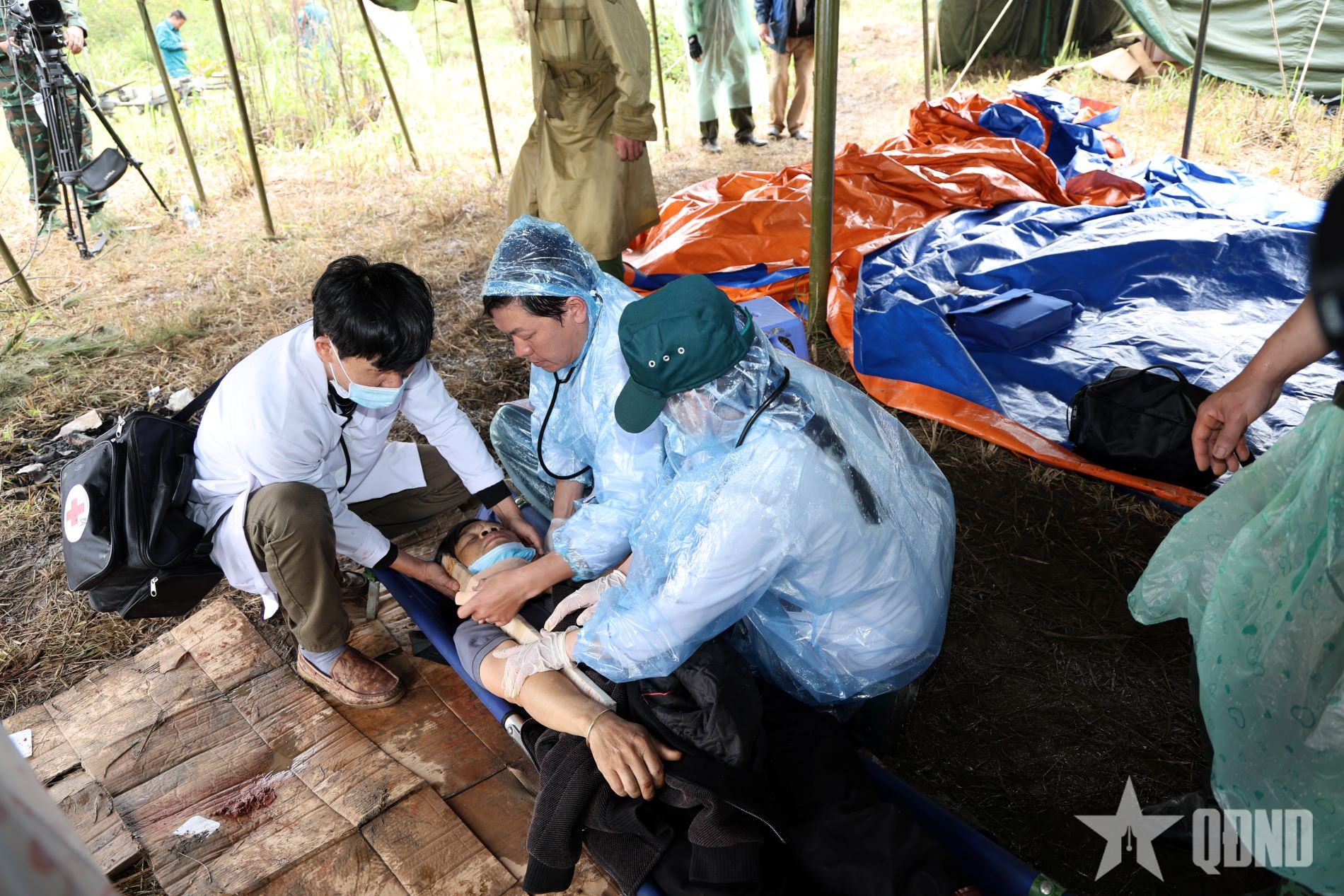 Nội dung thực hành xử trí tình huống gồm: Thực hành cứu hộ, cứu nạn người và tài sản bị lũ cuốn trôi. Sơ tán người dân và tài sản ra khỏi khu vực bị cô lập. Khắc phục môi trường tổ chức khám, chữa bệnh, phát thuốc cho dân, cung ứng lương thực, thực phẩm và nhu yếu phẩm, ổn định đời sống nhân dân vùng bị ảnh hưởng.