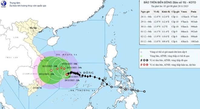 Cập nhật vị trí và đường đi của bão số 15 vào 5 giờ ngày 28/11. Ảnh: Trung tâm Dự báo Khí tượng thủy văn Quốc gia