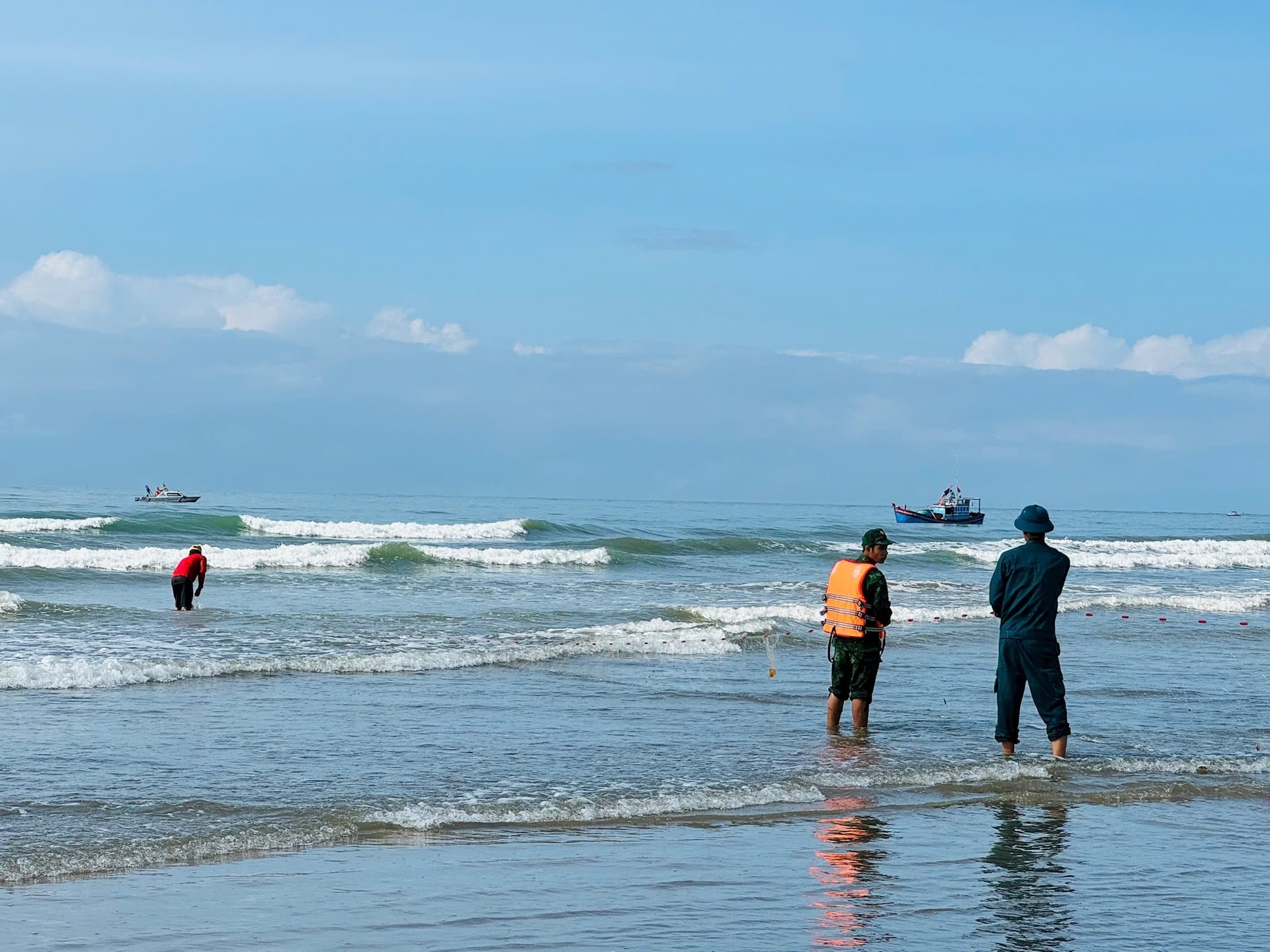 Lực lượng chức năng tham gia tìm kiếm, cứu nạn tại vùng biển gần bờ ở xã Tân Thành, tỉnh Lâm Đồng