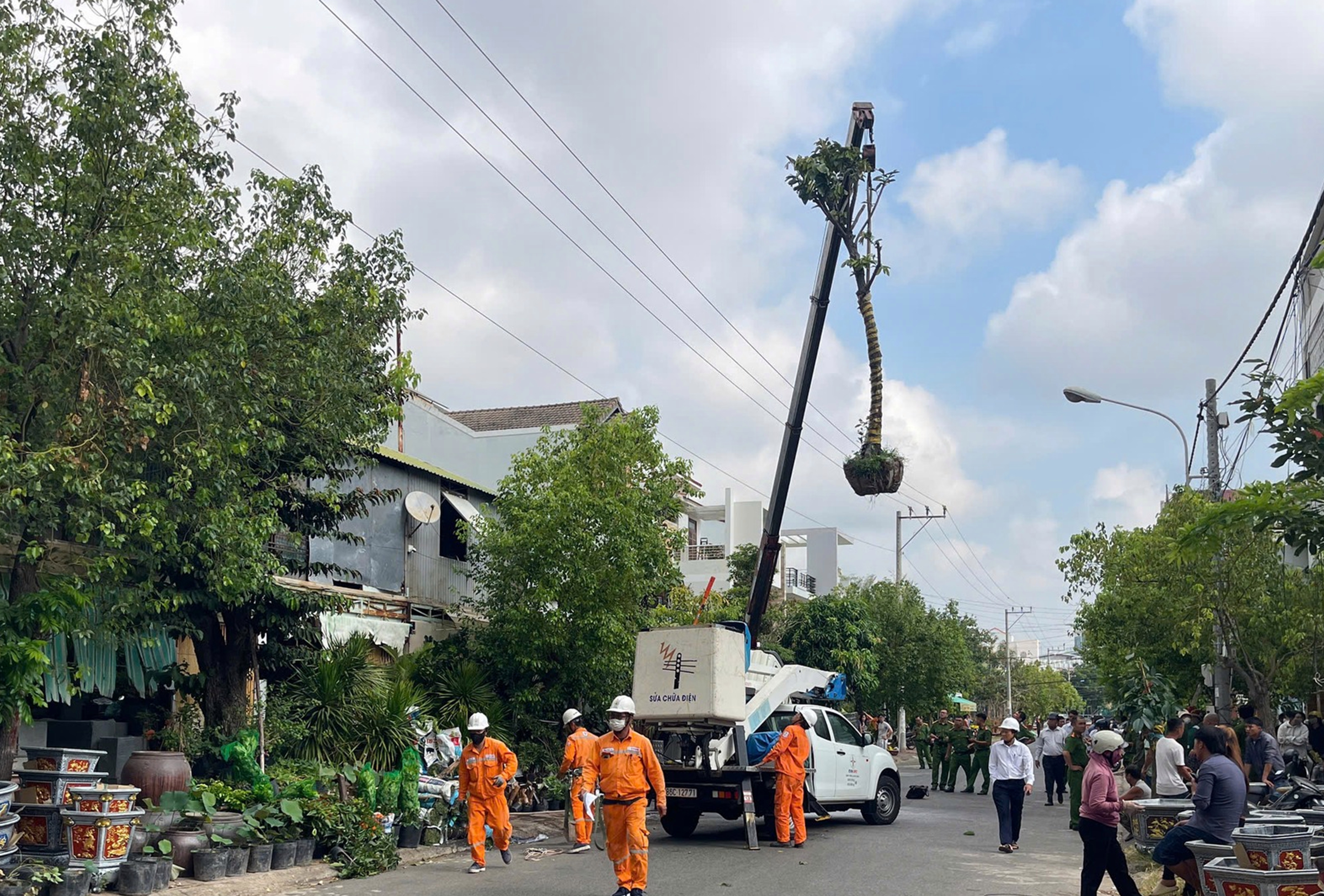 Trước đó, khoảng 8 giờ sáng cùng ngày, xe tải gắn cẩu mang biển số tỉnh Thanh Hóa cẩu cây cảnh vào khu vực tập kết. Trong quá trình vận hành, cần cẩu vướng vào đường dây điện khiến một người đàn ông đứng phía dưới bị phóng điện dẫn đến tử vong tại chỗ.