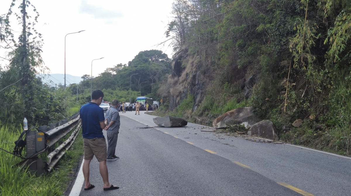 Lực lượng chức năng tổ chức xử lý các tảng đá lớn rơi xuống mặt đường trên đèo Bảo Lộc, Quốc lộ 20