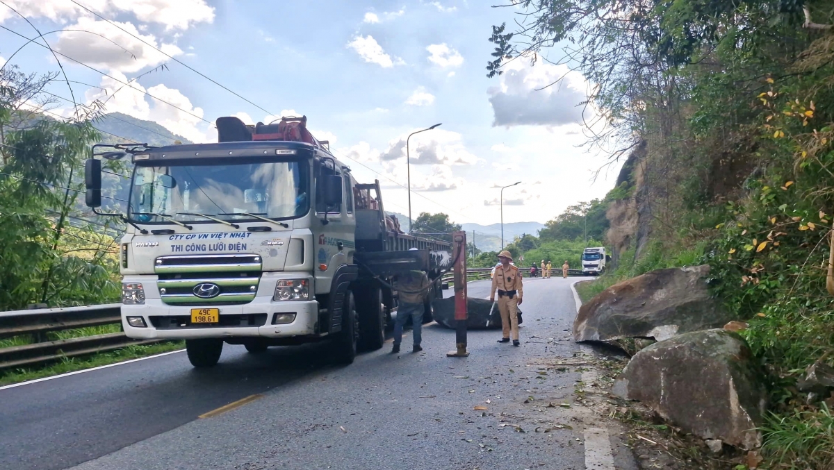 Lực lượng Cảnh sát giao thông phân luồng phương tiện trong quá trình xử lý khối đá lớn trên Quốc lộ 20, đoạn qua đèo Bảo Lộc