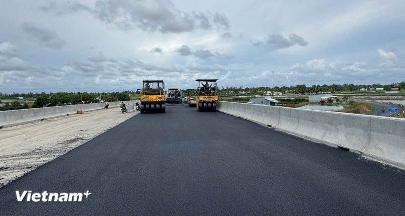 Nhà thầu huy động máy móc thi công thảm nhựa nền đường. (Ảnh: Việt Hùng/Vietnam+)