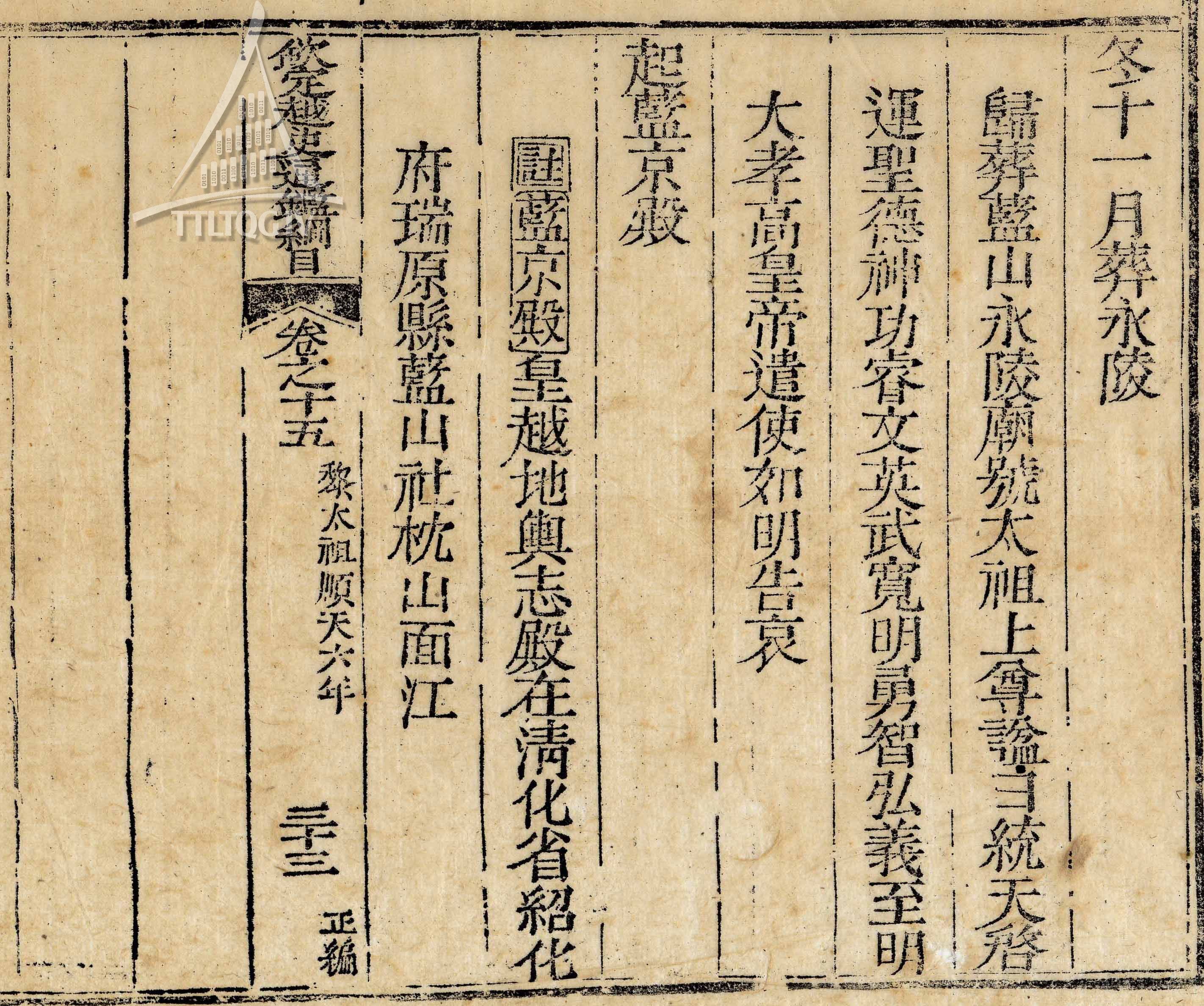 Bản dập Mộc bản sách Khâm định Việt sử thông giám cương mục quyển 15, mặt khắc 33 ghi chép về việc xây điện Lam Kinh. Nguồn: Trung tâm Lưu trữ quốc gia IV.