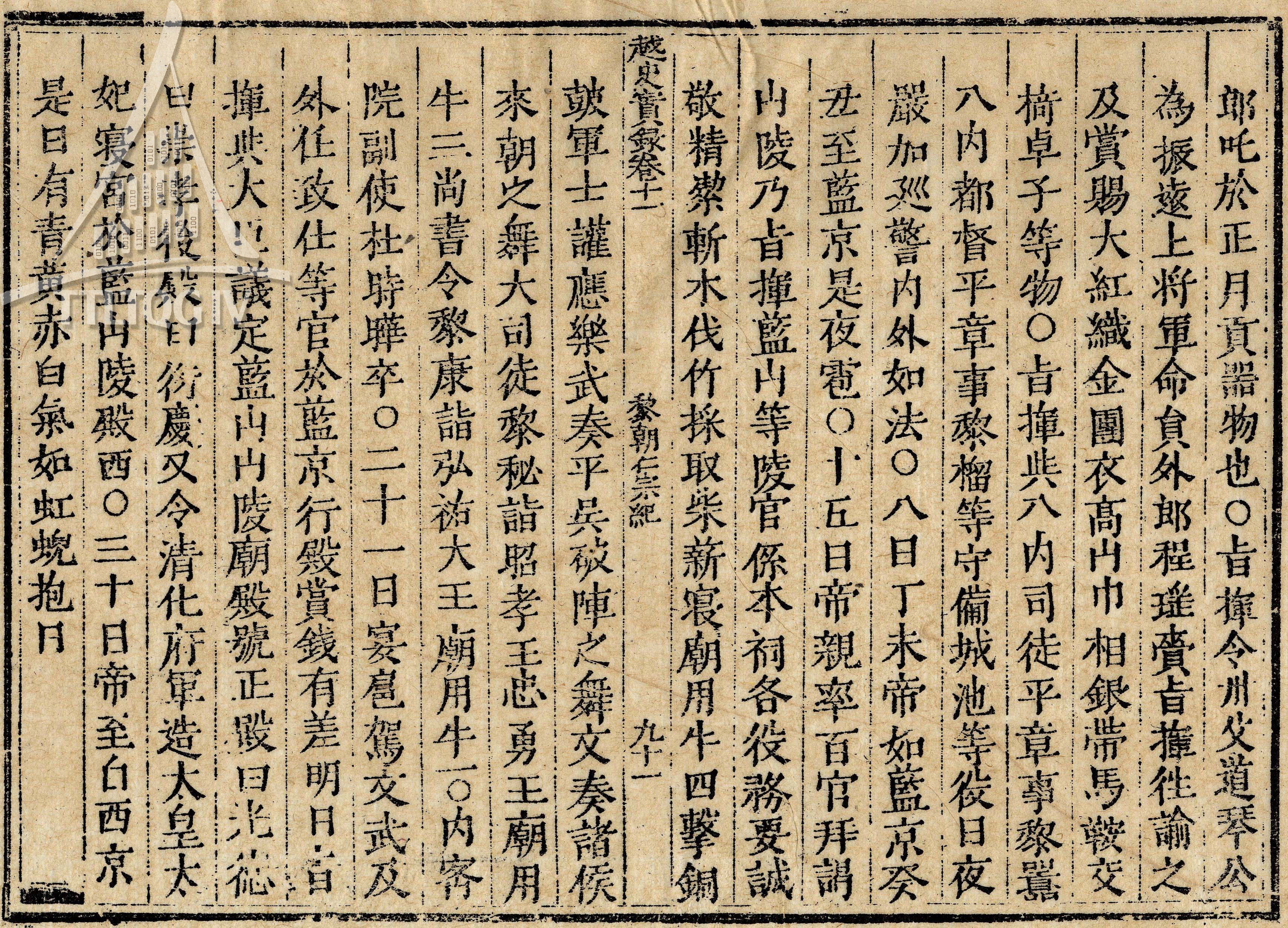 Bản dập Mộc bản sách Đại Việt sử ký toàn thư quyển 11, mặt khắc 91 ghi chép về việc đặt tên hiệu cho các miếu điện ở sơn lăng Lam Sơn. Nguồn: Trung tâm Lưu trữ quốc gia IV.