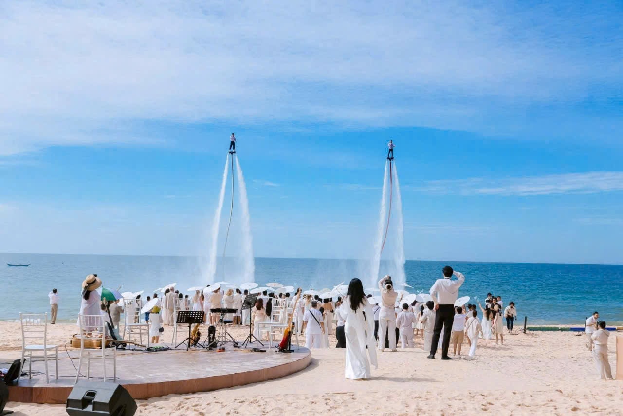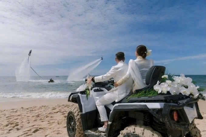 Thực tế, tại bãi biển khu vực Mũi Né, một đám cưới quốc tế giữa cô dâu Việt Nam và chú rể đến từ châu Âu đã để lại nhiều ấn tượng. Trong không gian ngập tràn nắng gió, màn trình diễn flyboard lần đầu tiên xuất hiện trong một lễ cưới tại khu vực đã thu hút sự chú ý của đông đảo khách mời. Vận động viên flyboard bay lượn trên mặt biển, tạo hình giữa không trung, góp phần làm nổi bật không khí trang trọng nhưng vẫn trẻ trung, hiện đại của buổi lễ.