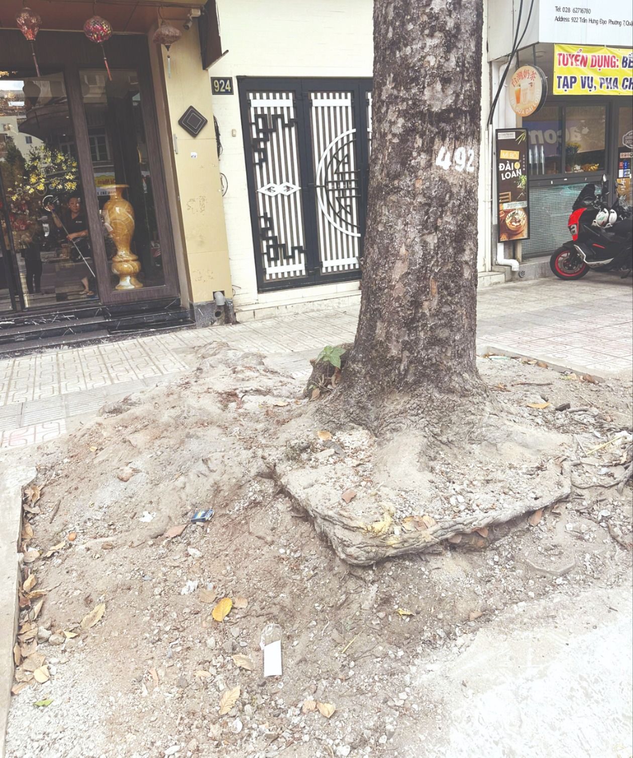 Thi công vỉa vè hạ cốt nền khiến một gốc cây lồi lên. Ảnh: QUỐC HÙNG