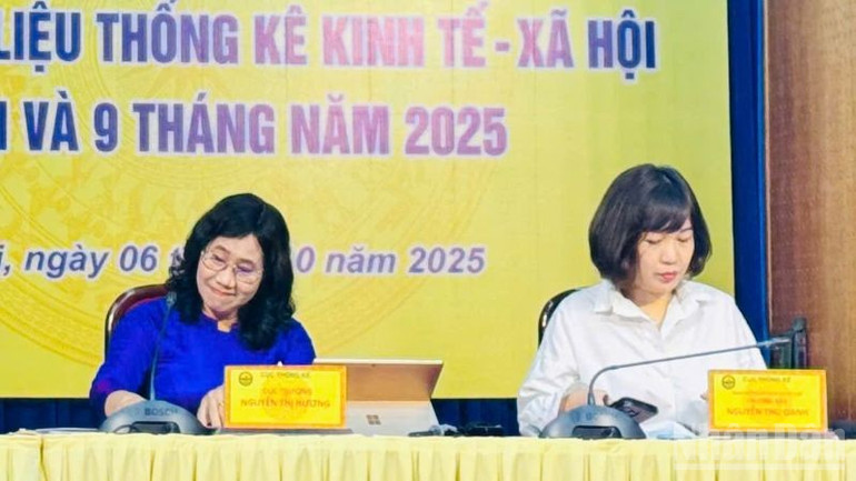 Bà Nguyễn Thu Oanh (áo trắng), Trưởng ban Thống kê dịch vụ và giá, Cục Thống kê. (Ảnh: HNV)