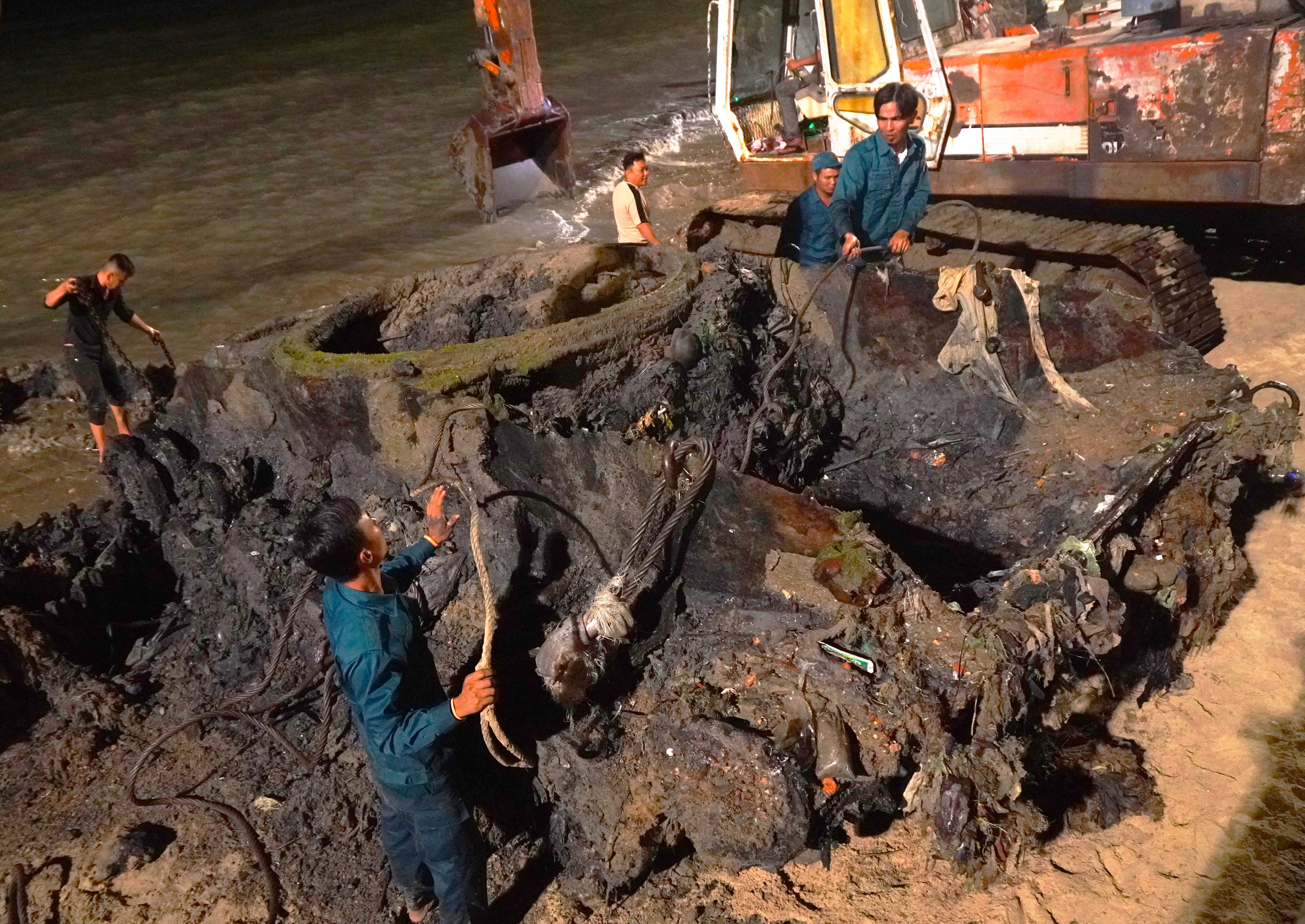 Sau 5 giờ trục vớt, đến 18 giờ 50 phút tối 29-4, lực lượng chức năng cẩu, tời thành công xác xe tăng lên khỏi mặt nước, đưa lên vị trí cao để kiểm tra, thu gom vật liệu nổ và hiện vật.
