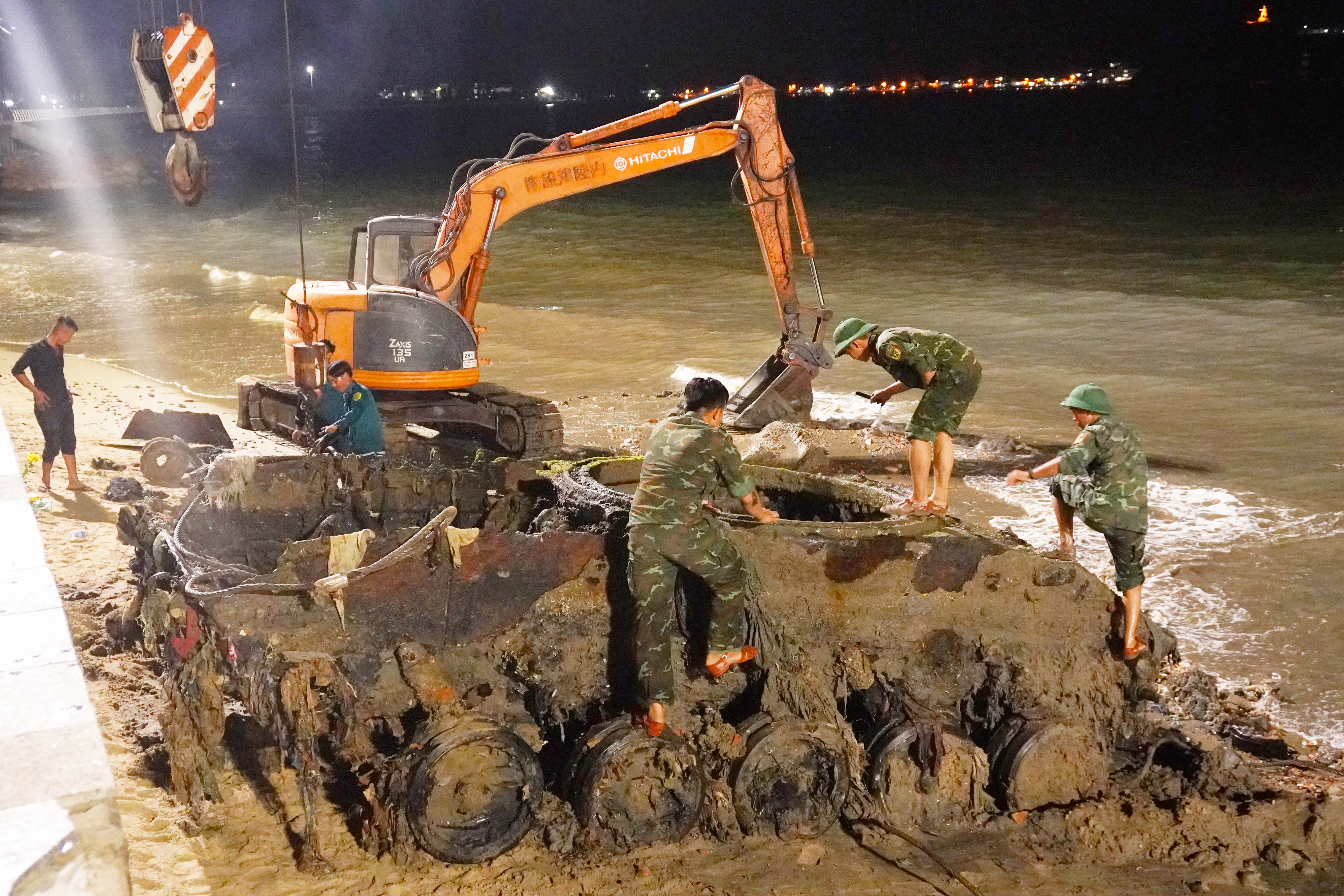 Xác xe tăng bị vùi sâu dưới cát, kèm nhiều vật liệu nổ, nhất là đạn cối còn nguy cơ nổ cao nên việc trục vớt được thực hiện thận trọng, khoa học nhưng khẩn trương theo thời điểm triều rút.