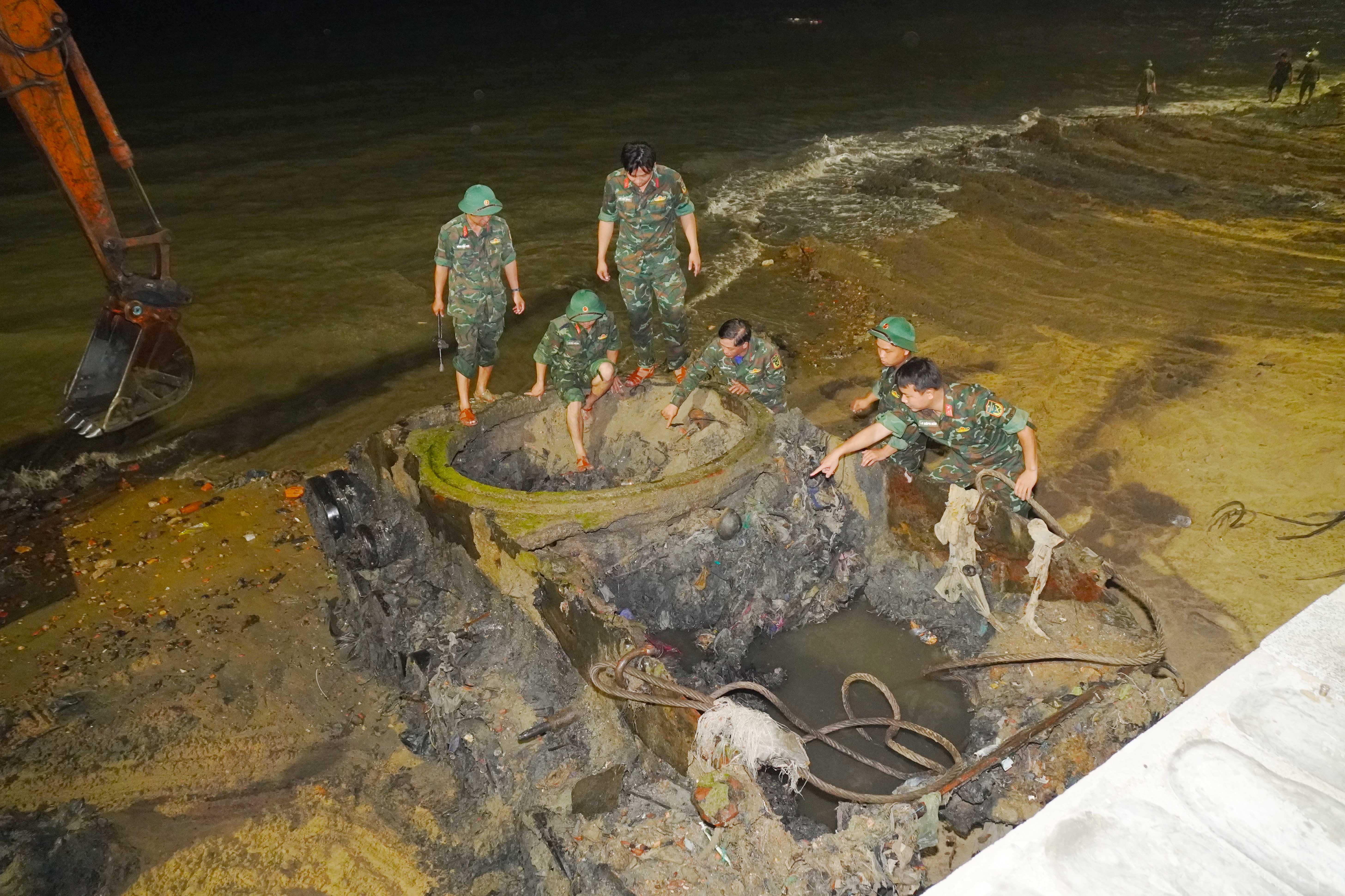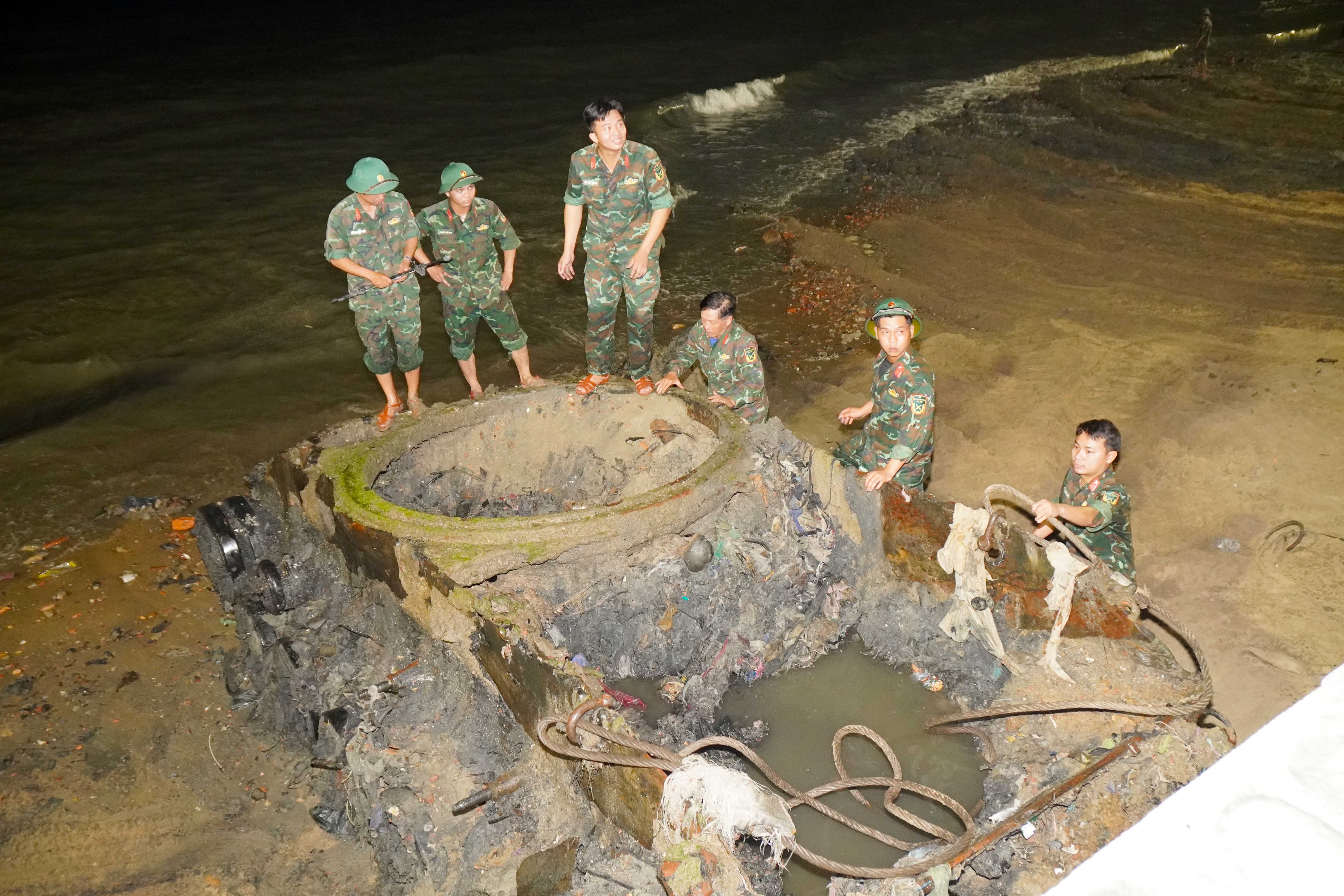 Lực lượng quân đội kiểm tra, tìm kiếm các hiện vật, vật liệu nổ khi trục vớt xác xe tăng vào đêm 29-4