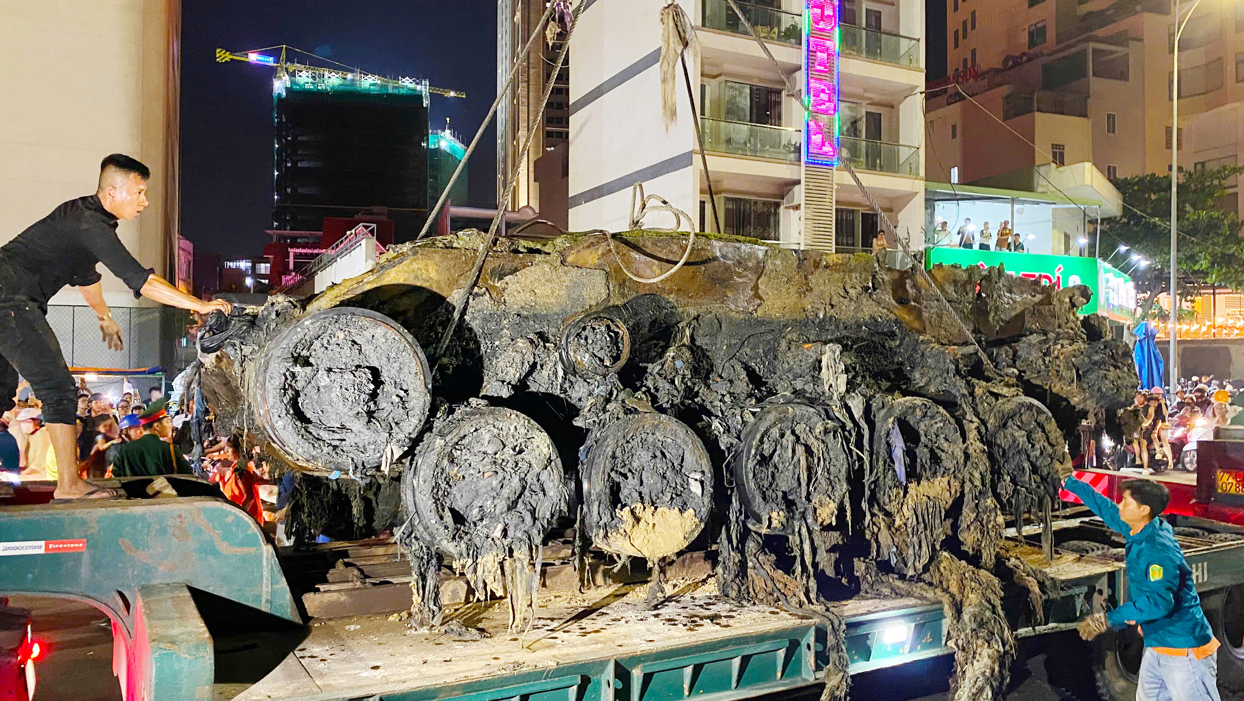 Đến khuya 29-4, lực lượng chức năng hoàn tất kiểm tra, cẩu xác xe tăng khỏi hiện trường, vận chuyển về xưởng sửa chữa.