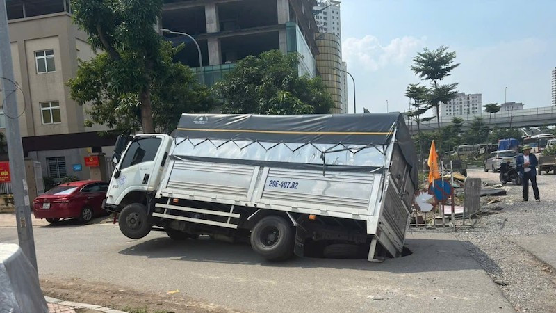 Sự việc xảy ra vào khoảng 13 giờ ngày 9/10 tại đoạn đường cuối ngõ 297 Trần Cung (phía sau trụ sở Công an phường Nghĩa Đô). Miệng hố sụt rộng khoảng 3m, khiến cho cả phần bánh xe của chiếc ô tô tải bị tụt xuống. Rất may không có thương vong về người.