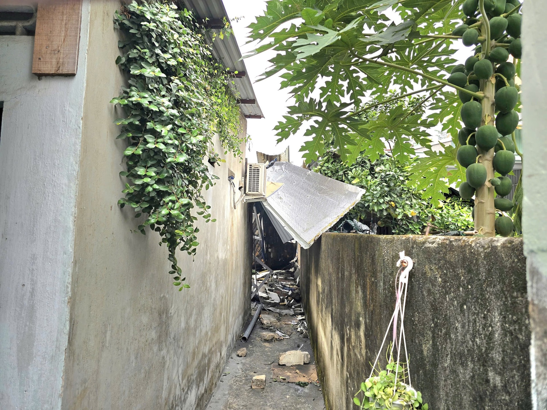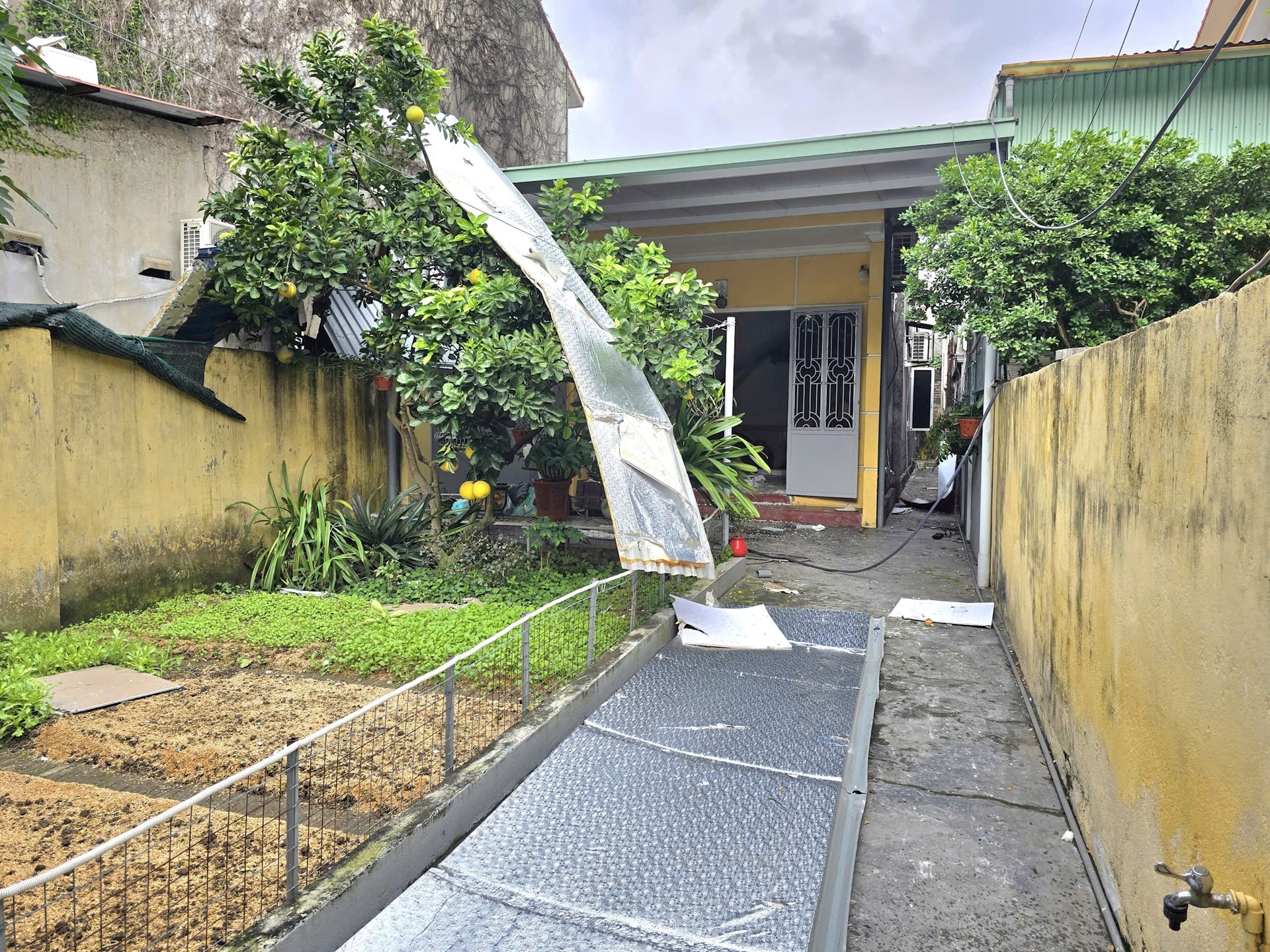 Mái tôn căn nhà bị cháy bay sang nhà hàng xóm. (Ảnh: Trần Khanh).