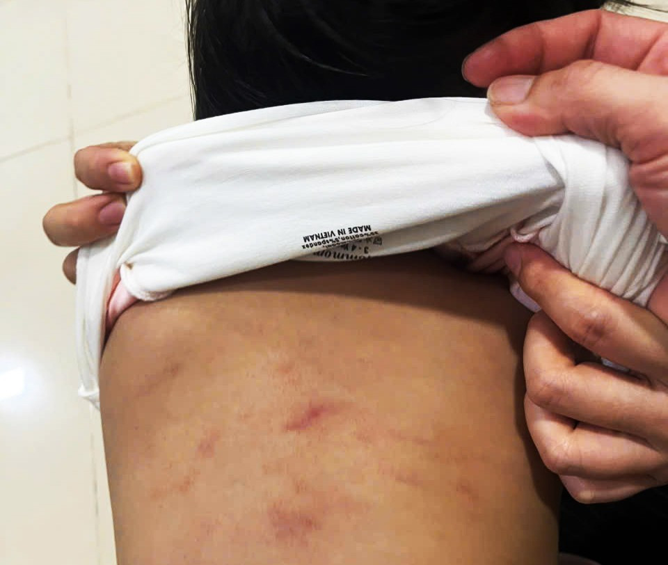 Vết bầm tím trên lưng bé N. (2 tuổi) nghi do bị bạo hành.
