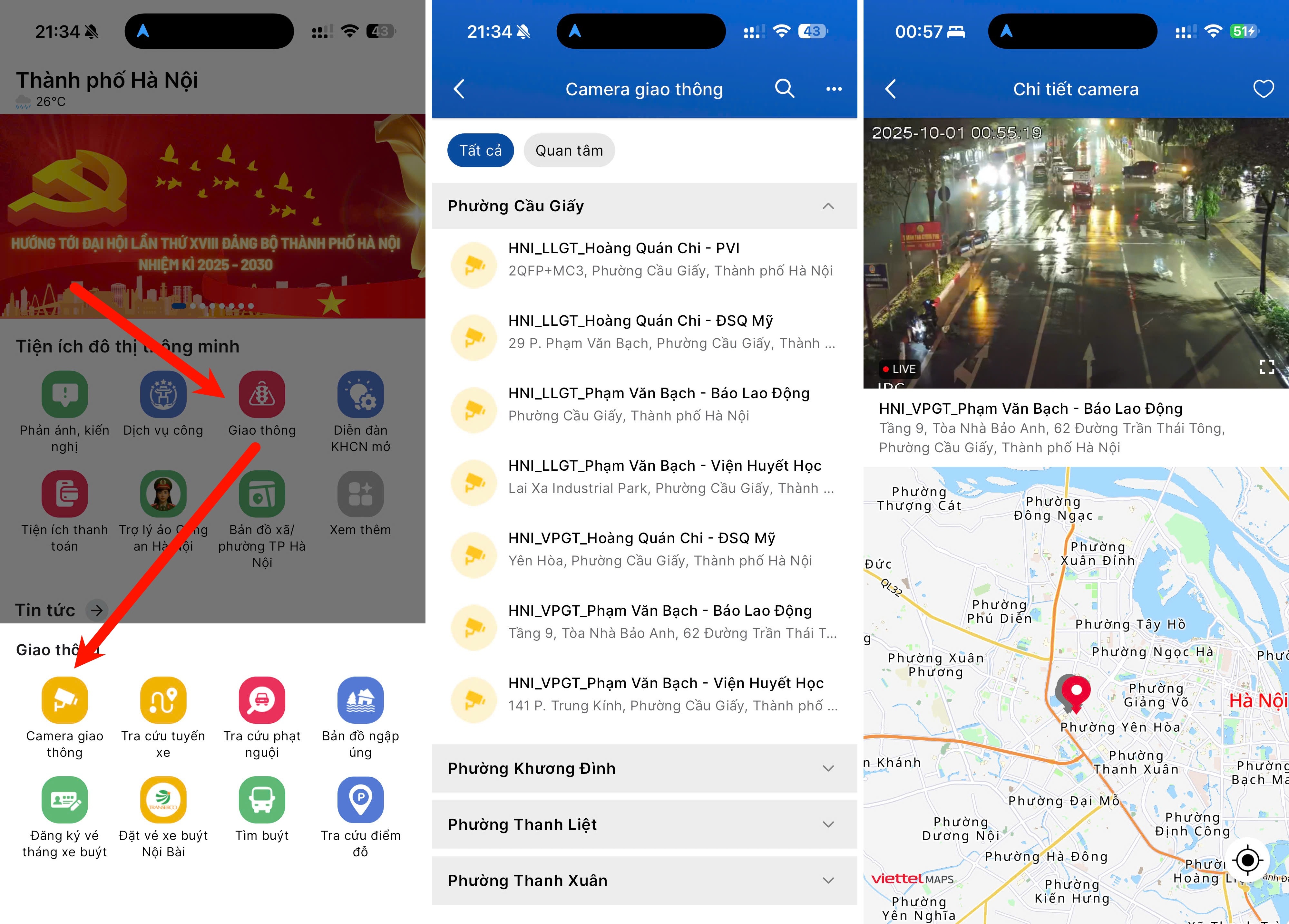 Để theo dõi camera, vào mục Giao thông > Camera giao thông, sau đó chọn camera muốn theo dõi theo phường và tuyến đường, gồm các giao lộ, ngã tư lớn trên địa bàn thành phố.